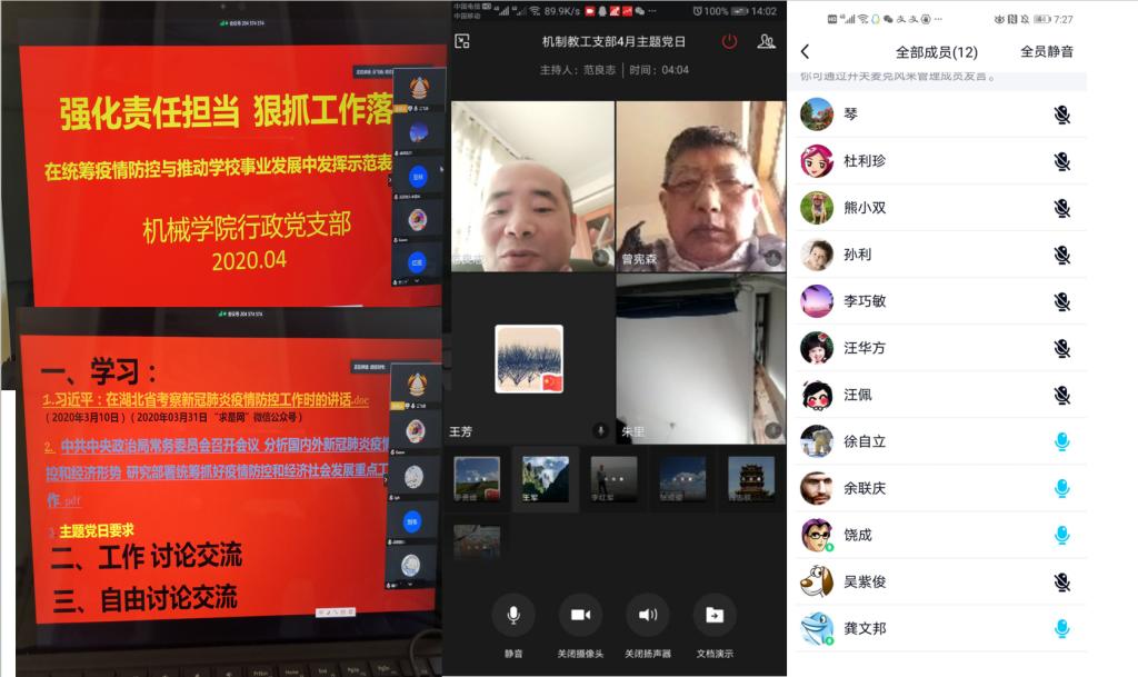 近日来,各支部按照组织部要求,认真开展主题党日活动内容。充分挖掘腾讯会议等云平台的优势,深入学习习近平总书记到湖北考察疫情防控工作时的重要讲话、习近平总书记在3月18日中共中央政治局常务委员会的讲话等会议精神,并结合工作进行了深入讨论。机械制造支部等教工支部还重点交流了党员老师线上教学情况,各学生支部还进一步探讨了《智造中国》学生讲党课等系列活动安排。行政支部还就学生毕业设计、课程重修补修、就业等服务情况作了广泛和深入的交流。