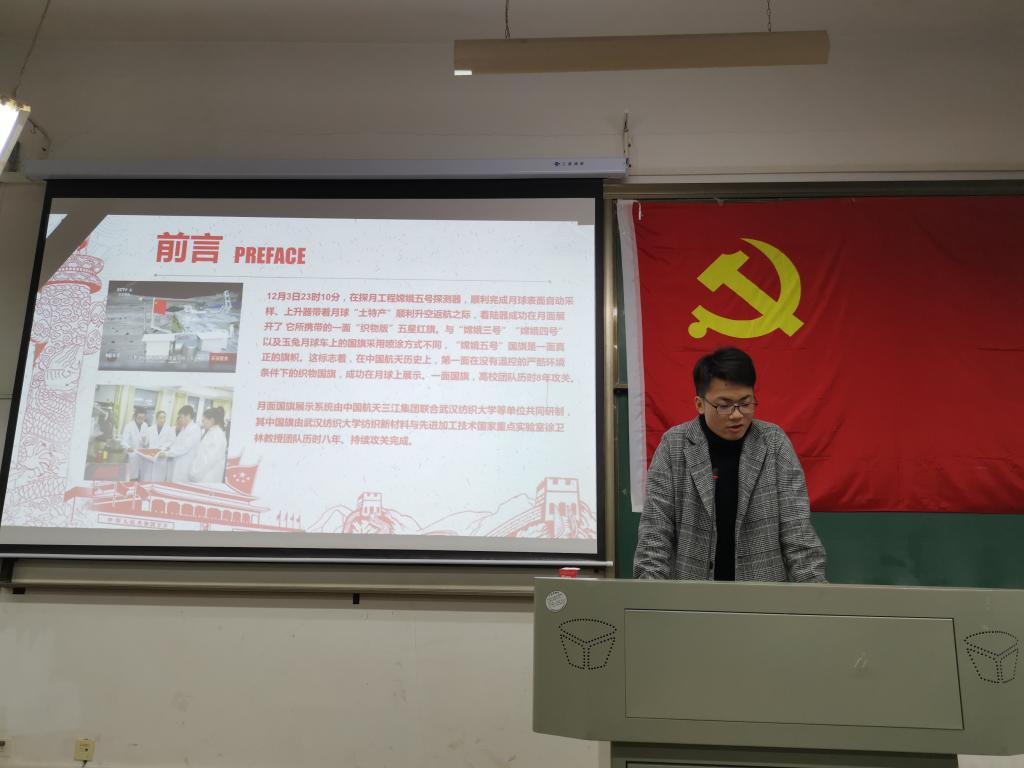 在《智造中国——嫦娥探月》学生讲党课过程中,学三支部柯贤波、徐聂文、陈英等三位学生党员从中国航天发展史、嫦娥探月工程介绍、嫦娥探月工程发展史和嫦娥探月工程的价值意义等四个方面,分别讲述中国航天事业发展历程。当同学们在演讲中说到,本次嫦娥五号月面国旗是由yl6809永利官网集团研制时,现场响起了热烈的掌声。