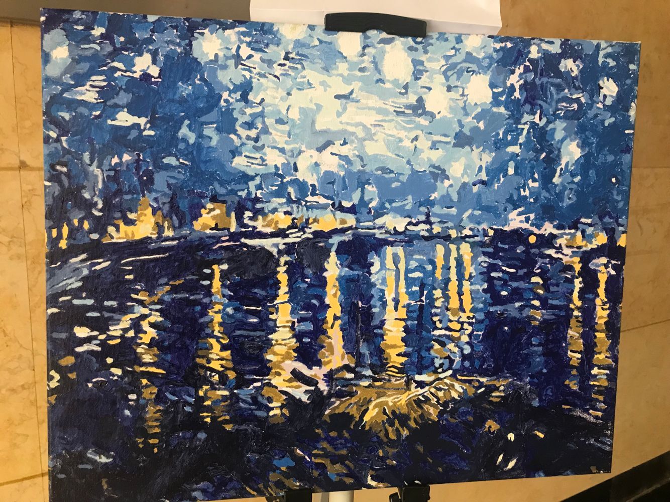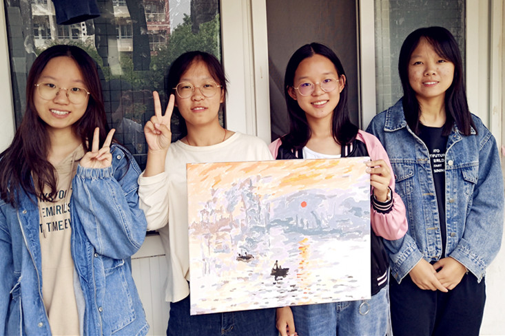 机械11902班的詹子晨在“画心画语”一栏里写到:我们班接到的任务是《罗纳河上的星夜》,这是一幅梵高的名作。我们没有绘画基础,就感觉这是一次不可能完成的任务。当画作传递到我手里的时候,我看到了同学们的努力。那些天,我们寝室除了军训就是在画画,最后画作完成,我们既感动又骄傲。魏源说,孤举者难起,众行者易趋,通过这次活动我深刻感受到团结的力量。