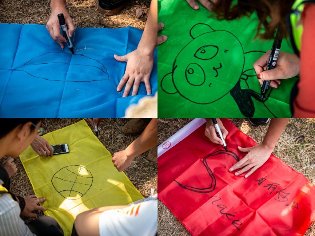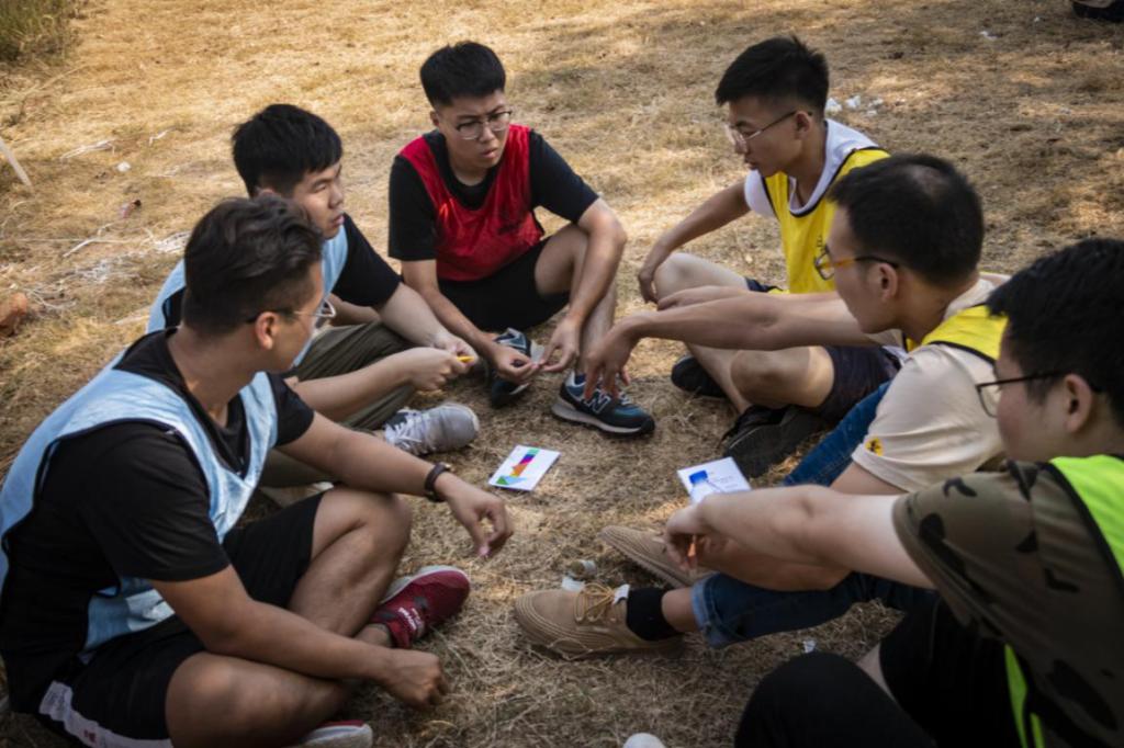 在“破冰”环节,同学们互相揉肩热身,放松身体。在教练的指导下分成两队,在热烈的讨论中,各队选出队长,随后四队分别选择“Snake队”、“大碗宽面队”、“坤坤队”以及“熊猫队”作为队名,在队长的带领下一起画队标、编口号,形成轻松的团队氛围,为接下来的游戏做好了准备。