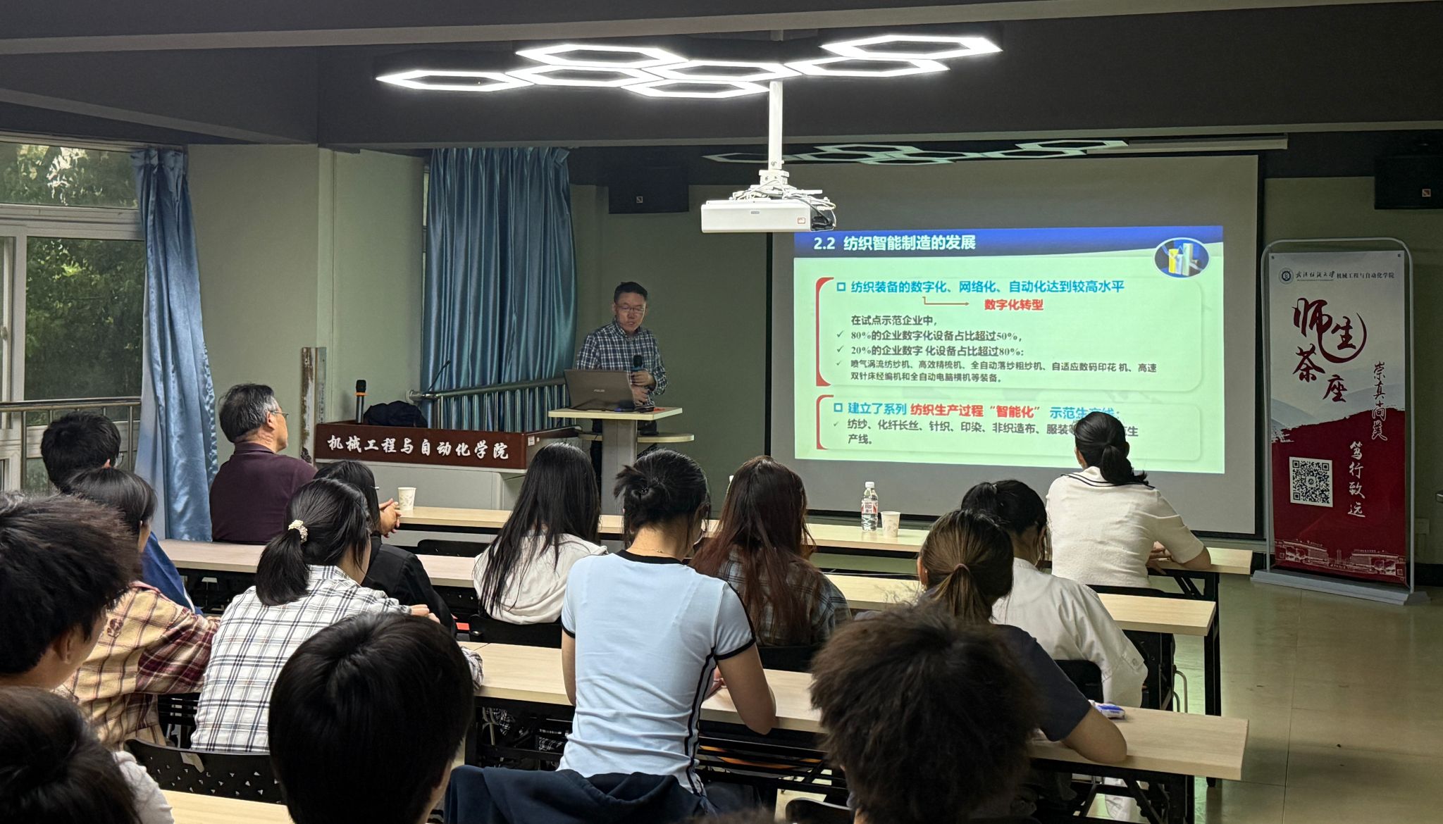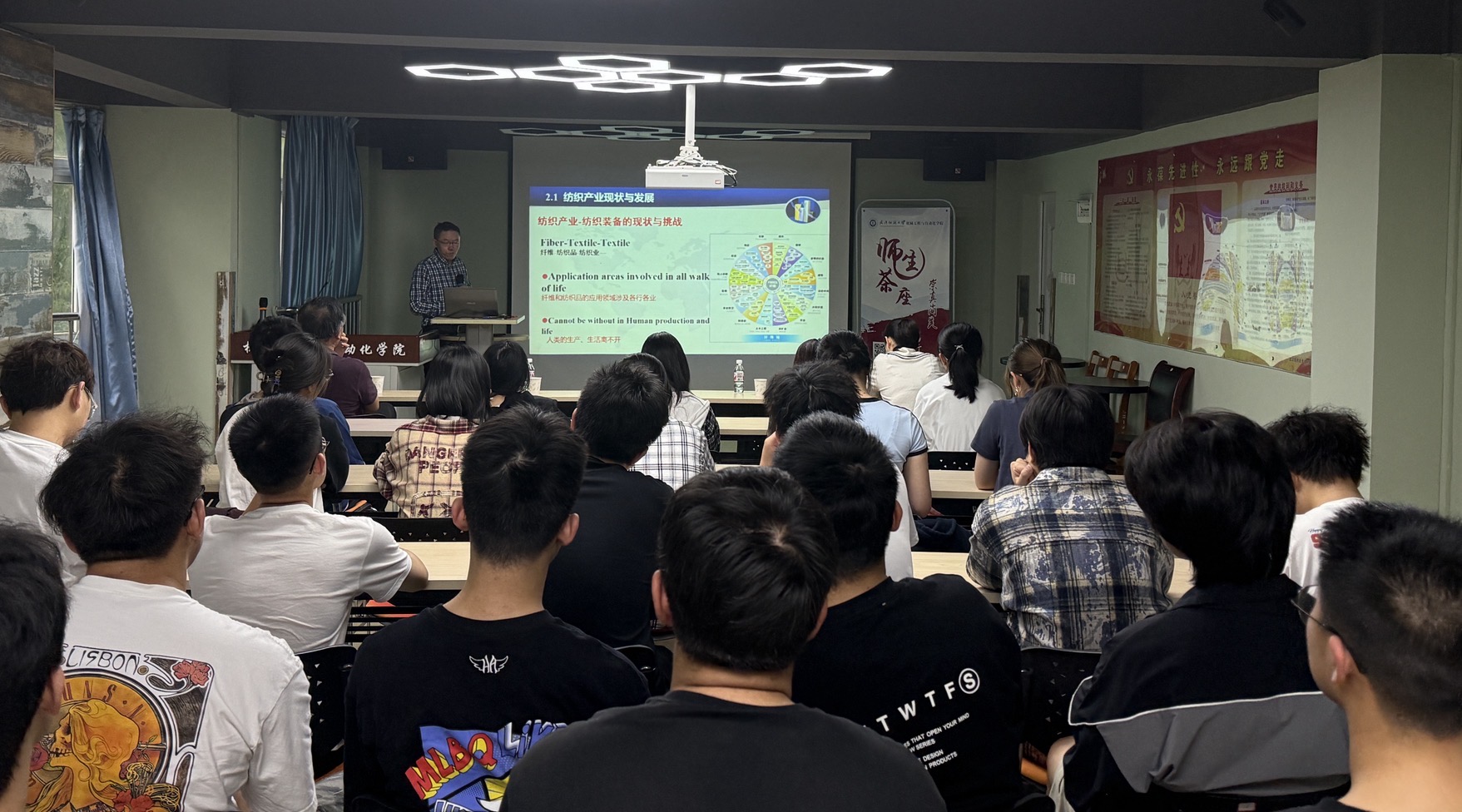 会上,梅教授首先介绍了科研平台和团队研究方向,从新质生产力引领制造业高质量发展、纺织产业现状和纺织装备技术发展方向等方面,深入浅出地剖析了新质生产力的发展路径、我国纺织产业的四大面向及纺织装备关键技术基础等领域的现状,并展望了机械学科在纺织、人工智能、新材料等交叉学科驱动下的发展趋势。最后,梅教授谈及大学生创新时特别强调:“创新是成功的必由之路,大学生群体要夯实基础、敢于突破,将国家战略需求与个人科研志趣相结合,在‘卡脖子’技术领域勇攀高峰”,希望机械学子能打下创新基础,养成创新思维,培养创新能力,奋力谱写成长发展的精彩篇章。