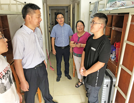 走访过程中,学院领导特别看望了家庭困难学生党少俊、谭坤和赵昊阳等同学。肖信华书记亲切嘱咐困难学生:物质上的匮乏只是暂时的,学校会想尽一切办法帮助大家克服困难渡过难关,鼓励大家不要气馁,刻苦学习,常怀感恩之心,以优异成绩回报母校,回馈社会。余联庆院长亲切地询问了同学们籍贯、饮食、在宿舍的生活作息等方面,还提醒同学们注意人身、财产安全,注意防范不明人员,有问题及时联系辅导员、班主任寻求帮助。
