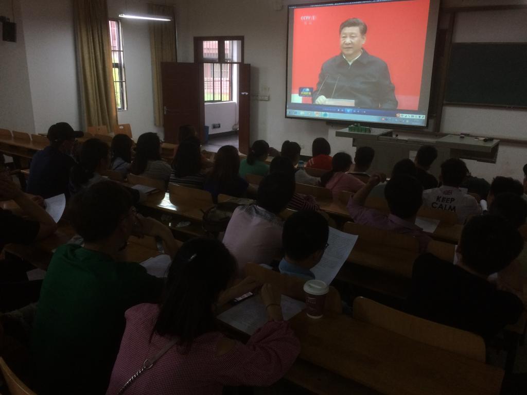 同学们说:习近平总书记五四青年节期间在北京大学发表的重要讲话,对我们新时代青年有这极大的勉励和鼓舞,为我们广大青年指明了今后前进的方向。作为一名新时代的青年大学生,我们一定牢记使命,努力践行爱国、励志、求真、力行的要求,做有理想有担当有责任的青年,在行动上深入践行习近平新时代中国特色社会主义思想,全面发展自己,使自己在时代的大潮中奋勇向前,拼搏进取,勇做时代的弄潮儿。