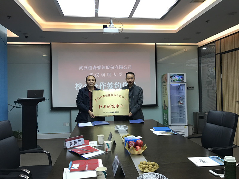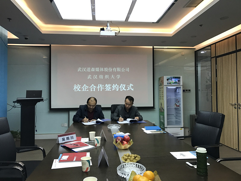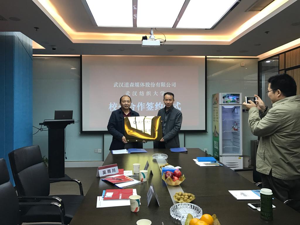10月26日,武汉纺织大学yl6809永利集团与武汉道森媒体股份有限公司在道森传媒总部举行了校企合作签约及授牌仪式。道森传媒董事长杨皆红、副总经理张庆华、首席技术官张学成以及学院执行院长燕怒、副书记卫东妹等一行出席了签约授牌仪式。
