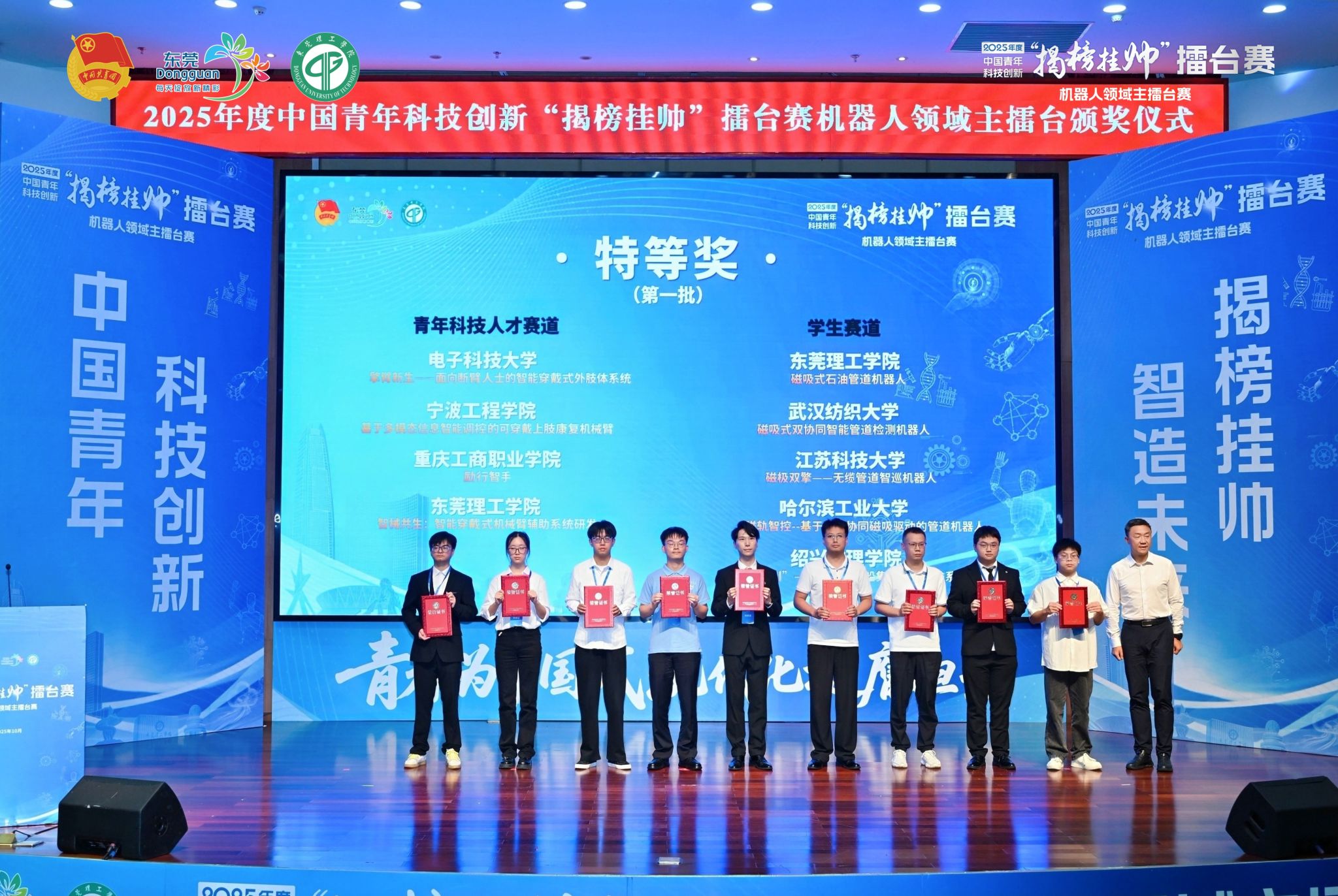 以国家需求为“榜”,以青春智慧“挂帅”。10月10日至12日,第十九届“挑战杯”全国大学生课外学术科技作品竞赛2025年度中国青年科技创新“揭榜挂帅”擂台赛“机器人领域”终审擂台赛在广东省东莞市圆满落幕。机械学子申报项目《磁吸式双协同智能管道检测机器人》成功入围此次“揭榜挂帅”擂台赛的终审决赛并斩获全国特等奖,实现了“挑战杯”竞赛国赛专项赛新突破。