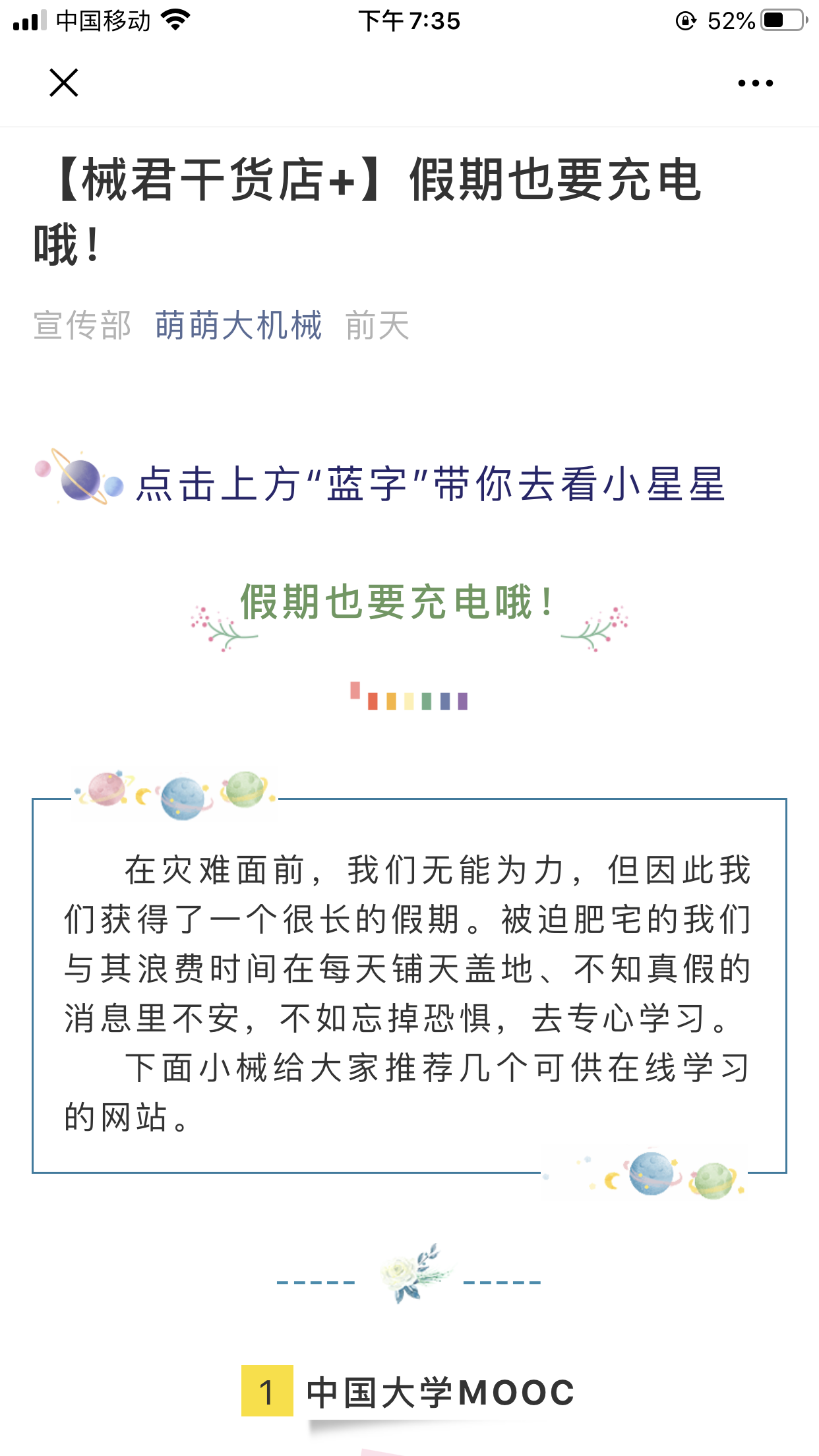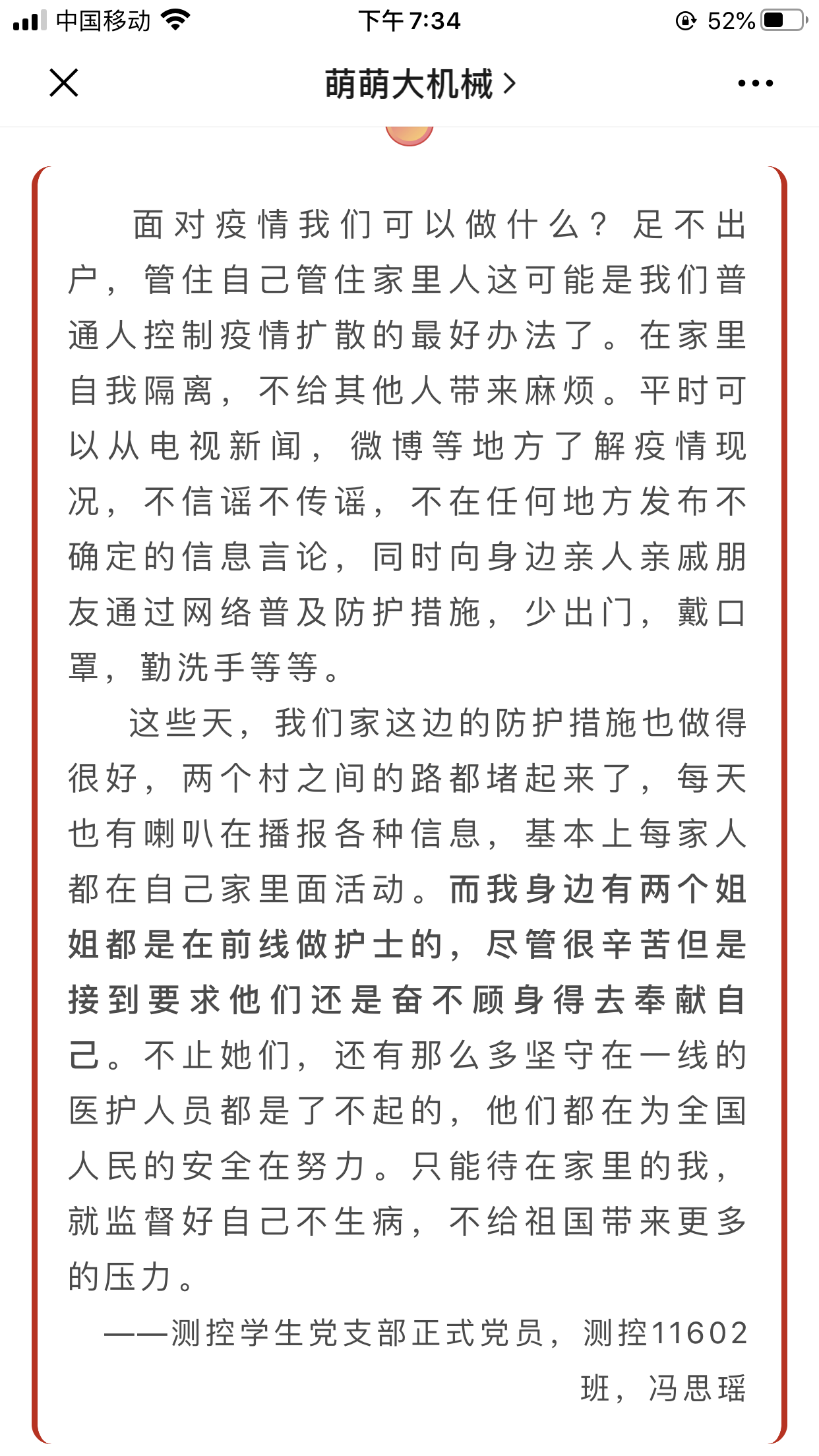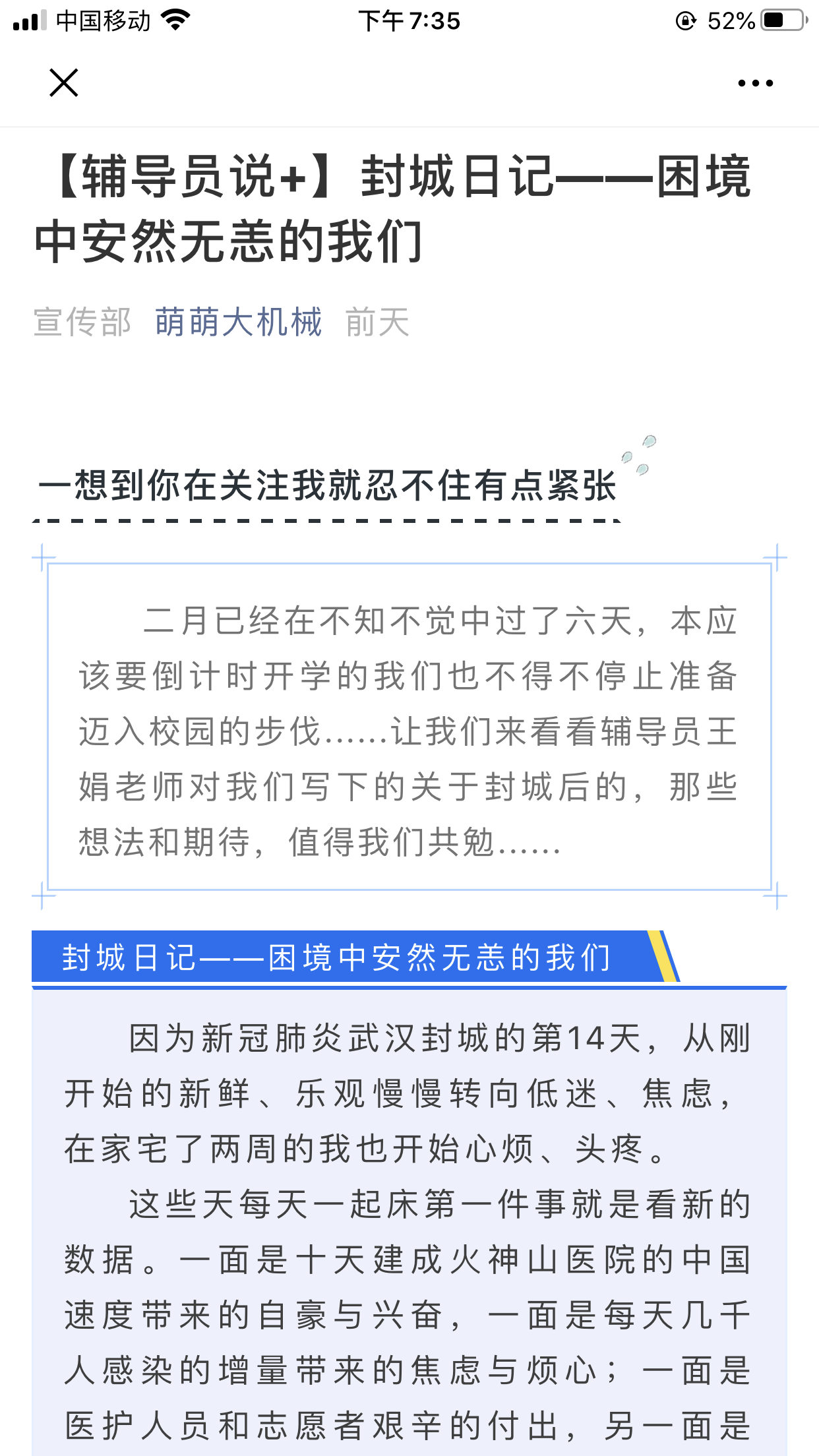 心系“疫”战一线,传递正能量。学院微信公众号“萌萌大机械”从1月22日即推出与防疫相关推文,截止至2月7日已推出19篇。内容从抗疫进度到防疫科普再到致敬抗疫英雄,学院微信公众号将全国一心抗疫的正能量源源不断输送给机械学子。