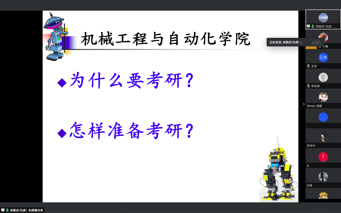 为让我院2017级本科生进一步了解考研、认识考研、明确目标、合理规划,增强继续深造的信心,积极做好考研备战。4月12日,永利集团利用腾讯会议在线召开了2017级考研动员大会。学院院长余联庆,2017级辅导员孙毅老师以及2017级同学参加了会议。