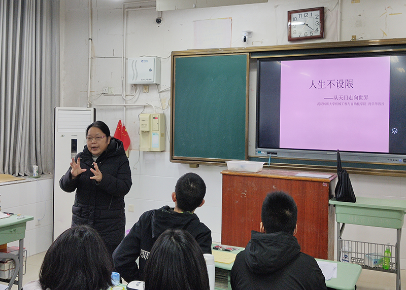 肖信华书记从历史沿革、学校声誉、学科专业、师资力量、人才培养、校园文化等多个方面,向两所中学的师生介绍了武汉纺大。在两所中学,肖书记以天门老乡和资深前辈的身份做了题为“人生不设限——从天门走向全世界”的讲座。肖书记语言亲切,幽默风趣,讲解深入浅出,娓娓道来,深深吸引了现场师生。现场不时响起阵阵热烈地掌声。肖书记在讲座中重点向同学们介绍了武汉纺大的招生计划和针对生源基地中学招生的相关政策,鼓励同学们积极报考。