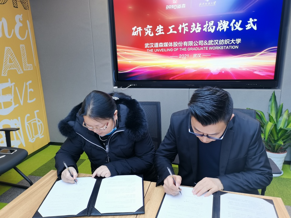 最后,学院党委书记肖信华与道森媒体总经理刘义签订校企合作协议,并相互授牌研究生工作站。