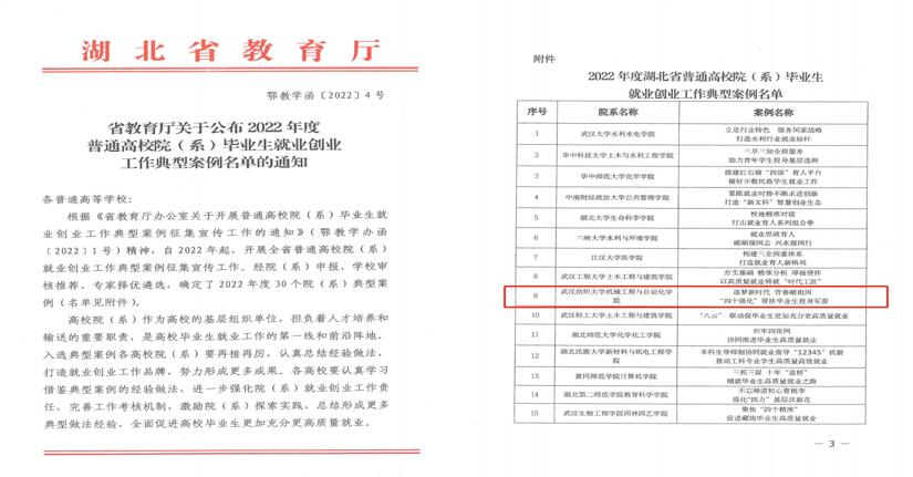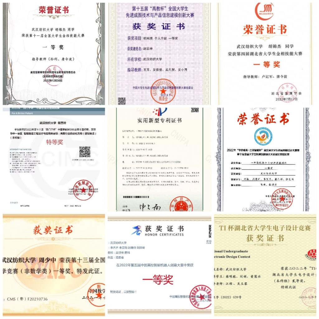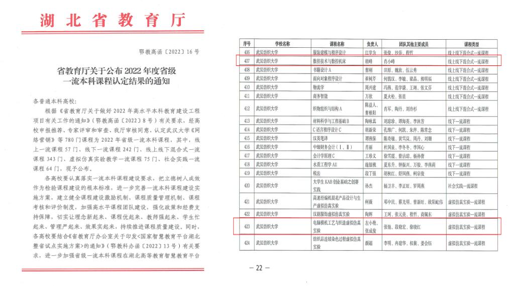 2022年,机械设计制造及其自动化专业工程教育认证自评报告获得专家一致好评,获得高票通过。在课程建设方面,继2021年《现代纺织工艺与设备》获批湖北省线下一流课程之后,2022年《电脑横机工艺与织造虚拟仿真实验》获批湖北省虚拟仿真一流课程,《数据技术与数控机床》获批湖北省线上线下混合式一流课程,至此学院线下一流课程、线上线下混合式课程和虚拟仿真一流课程三大类课程获得突破,为学生学习提供了优质的教学资源。