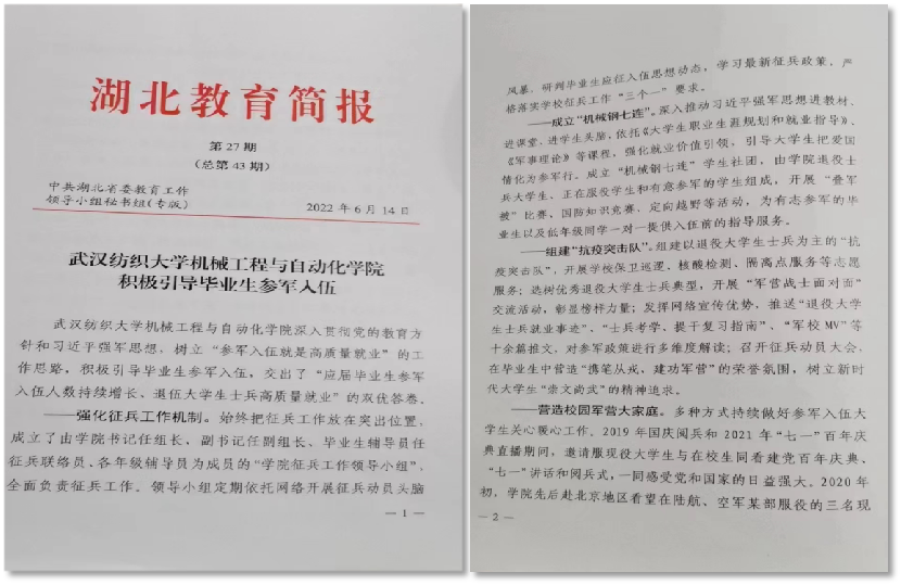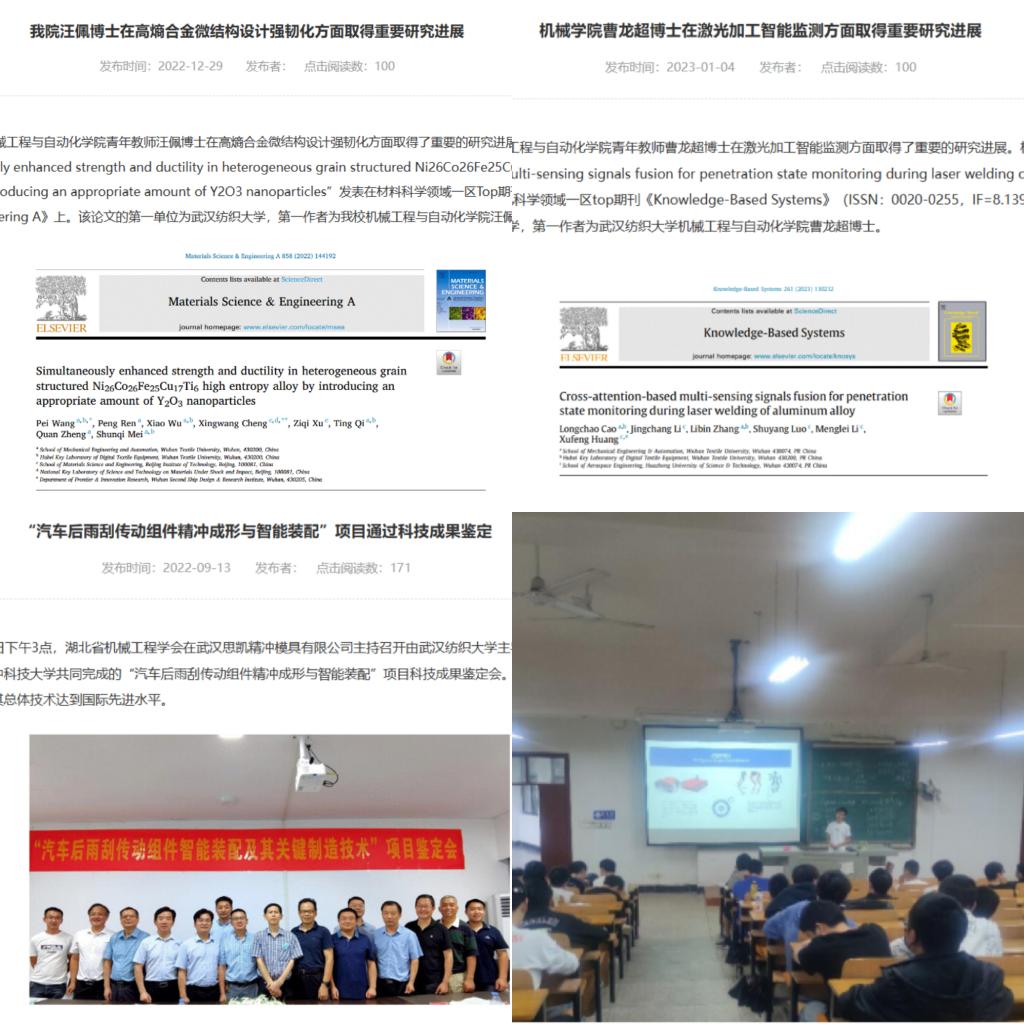 梅顺齐教授荣获2022中国纺联科学技术特别贡献奖—桑麻学者。学院加大人才引进力度,全年新报到博士8人,其中曹龙超博士获湖北省楚天学子荣誉称号。学院新增激光加工与检测技术和智能优化结构设计与可靠性研究两个学科团队。