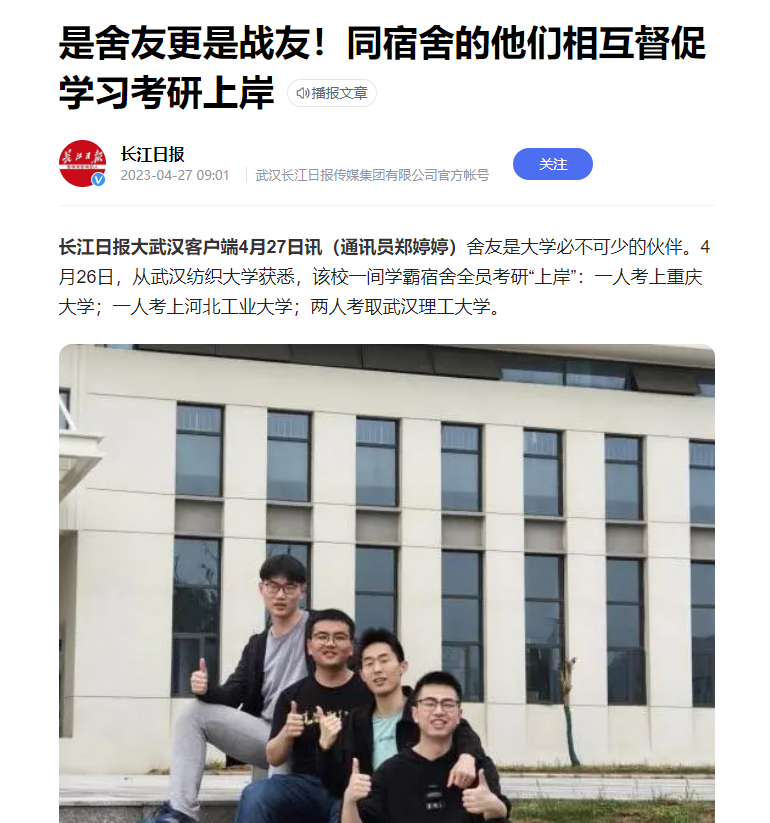 永利集团学霸宿舍“全员”上岸的新闻在纺大公众号获得了近万点击率,并受到多方媒体关注。近日他们“越努力越幸运”的事迹也登上长江日报《是舍友更是战友!同宿舍的他们相互督促学习考研上岸》。据悉,今年永利集团在号称“史上最难考研年”中,逆袭而上,取得了历史性突破辉煌成绩。2023届毕业生483人,最终考研“上岸”146人,录取率逾30%,较2022届增加4个百分点。其中,有69人被双一流大学录取,同学们上岸的高校中,不乏中国科学院大学、华中科技大学和武汉大学等超强名校。