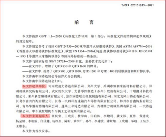 为贯彻落实《国家标准化发展纲要》,推进团体标准应用示范,引导制定高质量标准,工业和信息化部于2017年开始启动百项团体标准应用示范项目评选工作,2022年遴选出102项团体标准应用示范项目,其中中国铸造协会归口的《等温淬火球墨铸铁件》和《商用车发动机气缸盖铸件技术条件》两项标准入选。中国铸造协会T/CFA 020101243-2021《等温淬火球墨铸铁件》标准起草单位共18家,yl6809永利官网集团排序第五,yl6809永利集团龚文邦教授为该标准主要起草人之一。