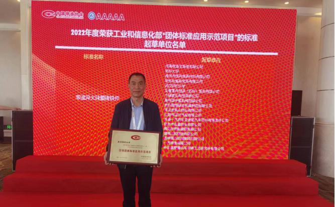 2023年5月10日,中国铸造协会在天津召开的第十九届中国铸造协会年会上对铸造行业2022年入选工业和信息化部“团体标准应用示范项目”的标准起草单位进行了表彰,龚文邦教授作为标准主要起草人受邀参加了年会及表彰颁奖。