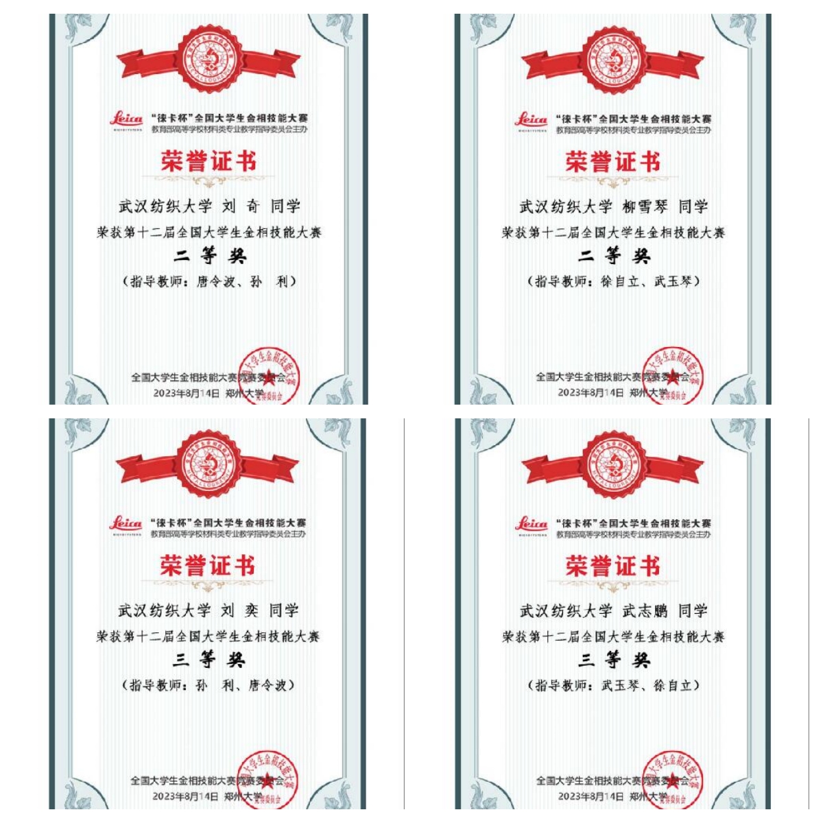 2023年8月14日,由教育部高等学校材料类专业教学指导委员会主办,郑州大学承办的”徕卡杯”第十二届全国大学生金相技能大赛(决赛)圆满结束。经过激烈角逐,yl6809永利官网集团参赛队员在我校永利集团徐自立、唐令波、武玉琴、孙利老师的指导下,经过训练和激烈角逐,21级刘奇、柳雪琴获个人二等奖,武志鹏、刘奕获个人三等奖。