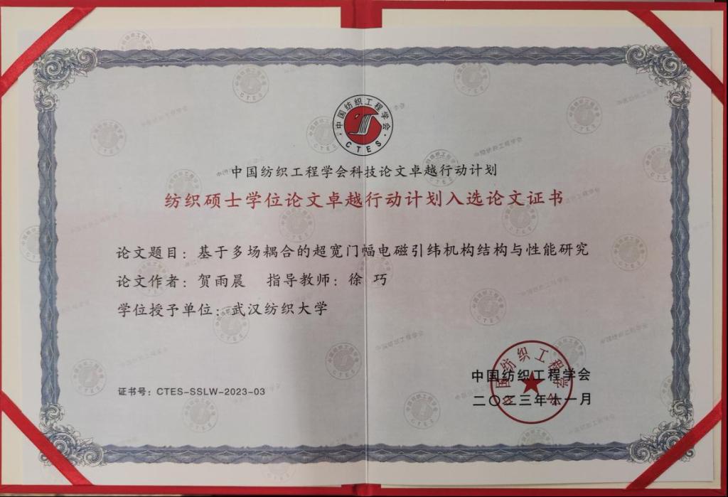 本次年会,宣布了2023年中国纺织工程学会科技论文卓越行动计划遴选结果,我院徐巧老师指导、研究生贺雨晨撰写的硕士学位论文《基于多场耦合的超宽门幅电磁引纬机构结构与性能研究》光荣入选了2023年度纺织博士、硕士学位论文卓越行动计划。