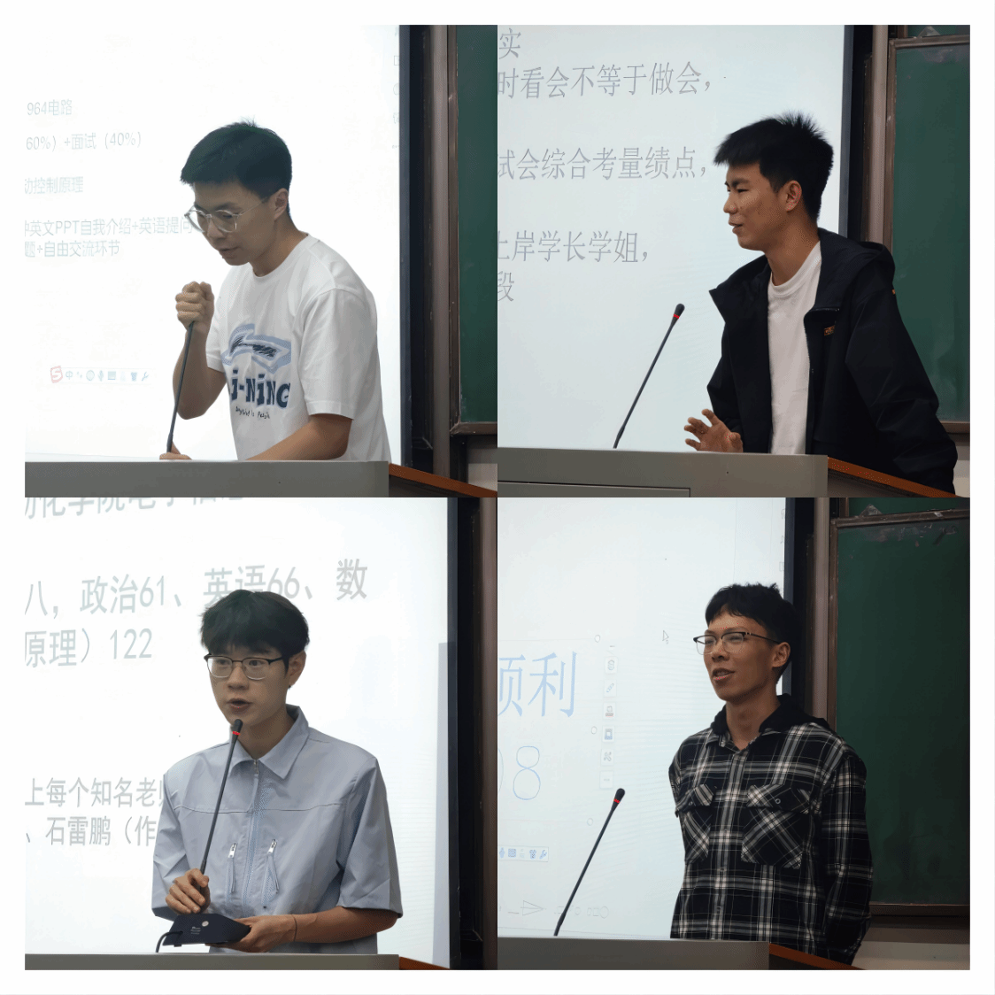 交流会中,四位同学用精心准备的PPT,分享在考研过程中是如何备战考试科目、如何择校、以及复习中应该注意的一些问题和一些应试技巧。李运鹏同学结合报考华东理工大学的经历,重点分享了自己的择校过程以及学硕与专硕的区别。李根同学结合报考武汉理工大学的经历,重点讲述专业课的复习技巧与考试情况。考上大连理工大学的杨顺同学传授专业课、英语学习的技巧,并特别强调词汇量的重要性。考上东南大学的马强同学着重介绍了他在院校选择、联系导师等环节的经历。