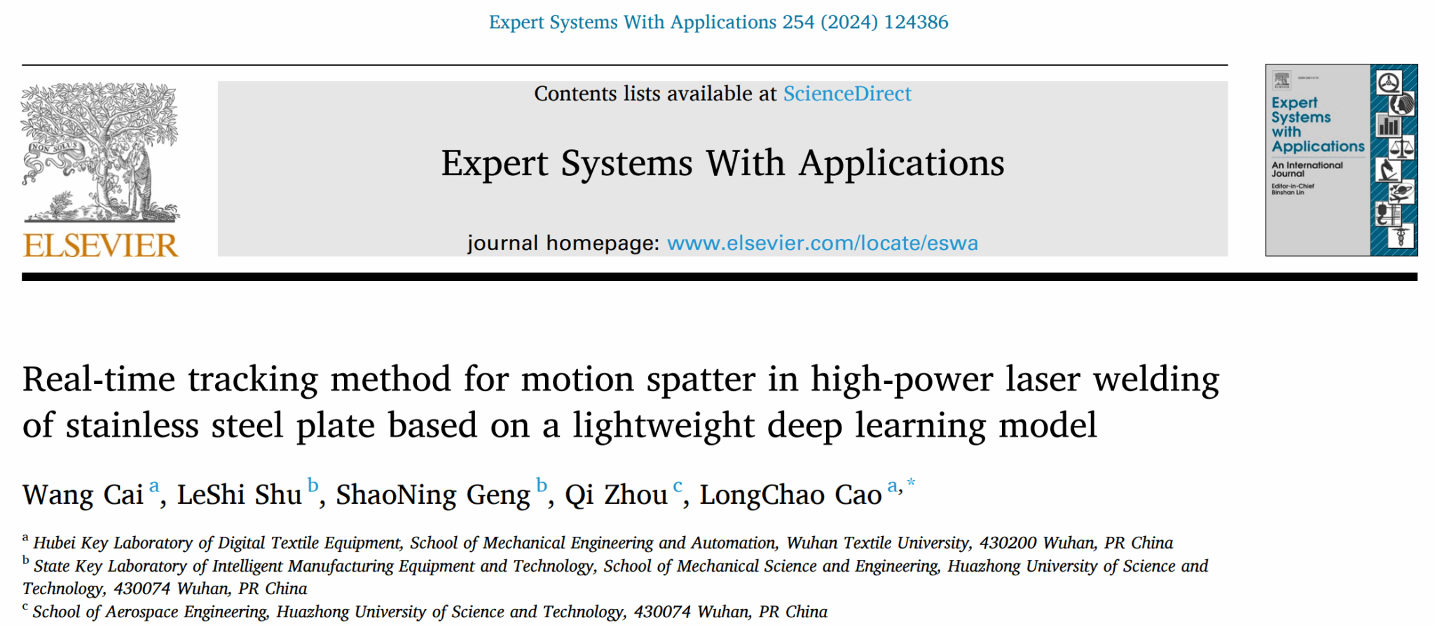近日,我校yl6809永利集团曹龙超博士课题组青年教师蔡旺在激光加工过程智能监测方面取得了重要的研究进展。相关成果以“Real-time tracking method for motion spatter in high-power laser welding of stainless steel plate based on a lightweight deep learning model”为题发表在计算机科学领域中科院一区Top期刊《Expert Systems with Applications》(ISSN:0957-4174)上。该论文的第一单位为yl6809永利官网集团,第一作者为永利集团蔡旺博士,通讯作者为永利集团曹龙超特聘教授。