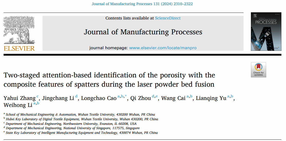 近日,我校yl6809永利集团青年教师曹龙超博士与美国西北大学张亚辉博士、新加坡国立大学李京昌博士合作在激光加工智能监测方面取得了重要的研究进展。相关成果以“Two-staged attention-based identification of the porosity with the composite features of spatters during the laser powder bed fusion”为题发表在工程技术领域中科院一区Top期刊《Journal of Manufacturing Processes》(ISSN:1526-6125)上。该论文的第一单位为yl6809永利官网集团,曹龙超博士为唯一通讯作者;第一作者为美国西北大学机械系张亚辉博士,其博士毕业于荷兰阿姆斯特丹大学。