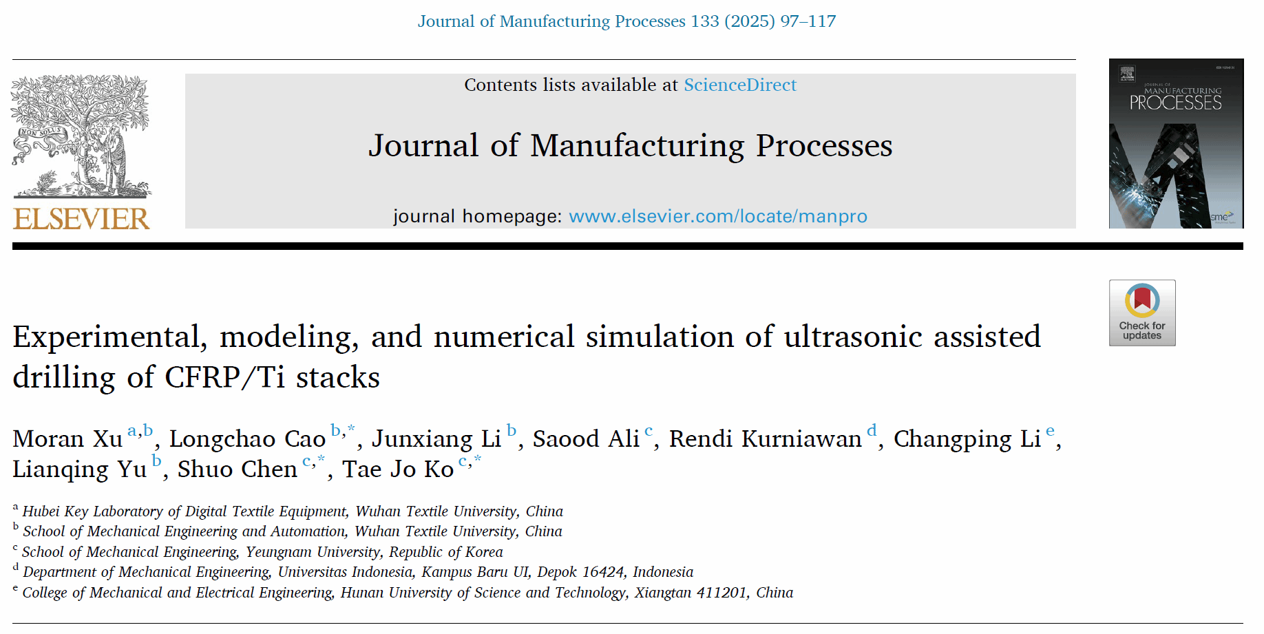 近日,我校yl6809永利集团曹龙超课题组青年教师徐默然博士在超声辅助钻削CFRP/Ti叠层材料理论建模和数值仿真方面取得了重要的研究进展。相关成果以“Experimental, modeling, and numerical simulation of ultrasonic assisted drilling of CFRP/Ti stacks”为题发表在工程技术领域中科院一区Top期刊《Journal of Manufacturing Processes》(ISSN:1526-6125)上。该论文的第一单位为yl6809永利官网集团,第一作者为yl6809永利官网集团永利集团徐默然博士,第一通讯作者为yl6809永利官网集团永利集团曹龙超博士。