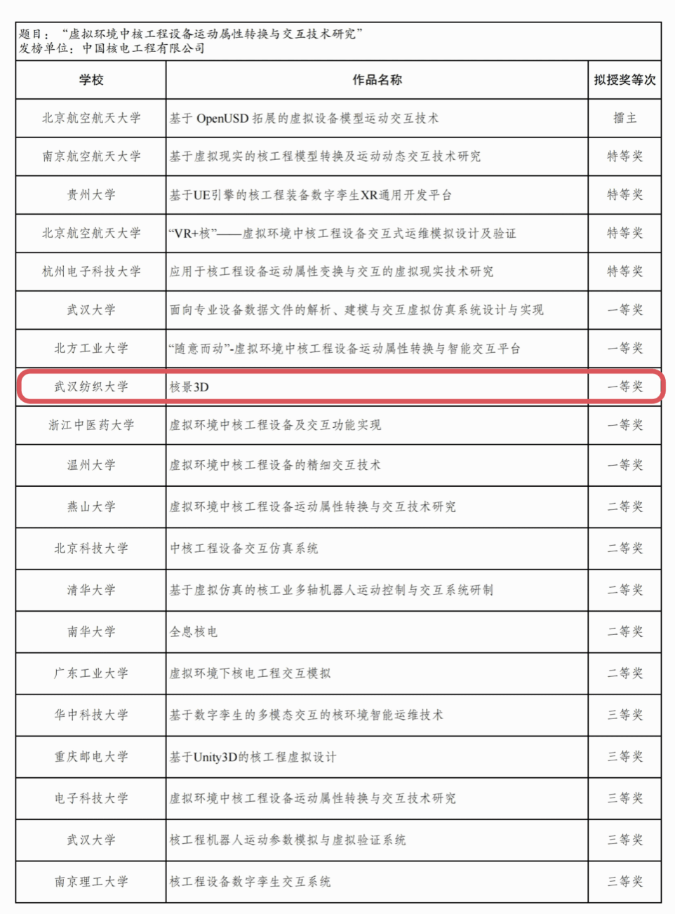张蒂等同学参赛项目缘于传统核工程设备的运维及管理需要大量人工操作,存在数据复杂、交互效率低下等问题,难以满足现代核工程高效、安全的需求。团队基于虚幻引擎开发平台和数字孪生技术,开展了系统化的设计研发,攻克了CAD模型数据格式转换、模型动作分解及交互设计简化等技术难题,开发出一款基于虚拟现实(VR)的核工程设备模型检视与操作软件《核景3D》。该软件通过多种交互方式,实现了设备的沉浸式观察与操作,项目成果可应用于特种工程领域的虚拟设计,提升设计智能化水平。该项目荣获全国一等奖充分彰显了我院研究生的科学研究水平和创新实践能力。