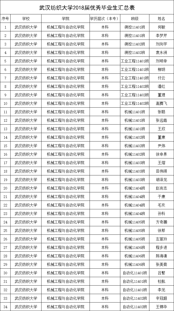 经过学生本人申请、班级集体评议、学院2018届优秀毕业生评选工作小组审核,报经学院党委同意,根据《yl6809永利官网集团本科优秀毕业生评选办法》(武纺大招毕【2018】3号)相关规定,拟授予以下34名同学优秀毕业生称号。具体名单如下: