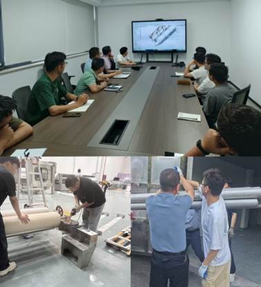实践团首先参观了创新中心的纺织科技馆,不仅学习了传统纺织技术,也深深地感受到了传统纺织技术与现代先进纺织技术的碰撞,掌握了纺织技术更新迭代的过程。在座谈会上,同学们将自身专业知识、机器零件的配合以及电路控制等实际操作结合起来,深入现场与老师们展开交流,一同探讨设备可优化和改进的方法策略。