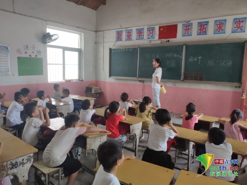图为支教队员向三年级的小朋友们介绍国庆节的相关知识。