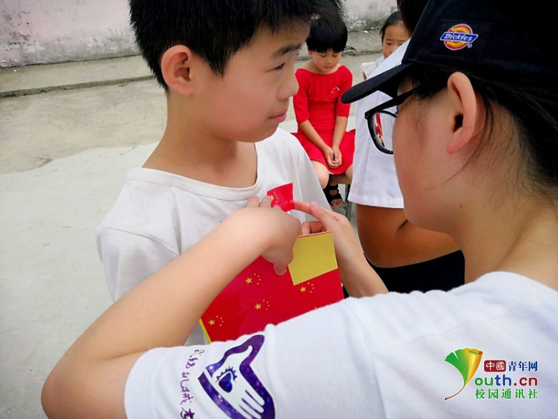 图为拓梦支教队队员为小朋友们在胸前贴上五星红旗。