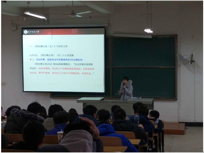 宋老师组织17级全体学生认真学习了《yl6809永利官网集团学生手册(2018年版)》和2015年11月1日正式实施的《刑法修正案(九)》中关于考试作弊入刑的有关条款,详细解读了相关规定,让大家认识到应该养成良好的行为习惯,注意宿舍安全文明,同学交往文明有礼,考试中重视考风考纪,坚决杜绝各类违纪行为的发生。