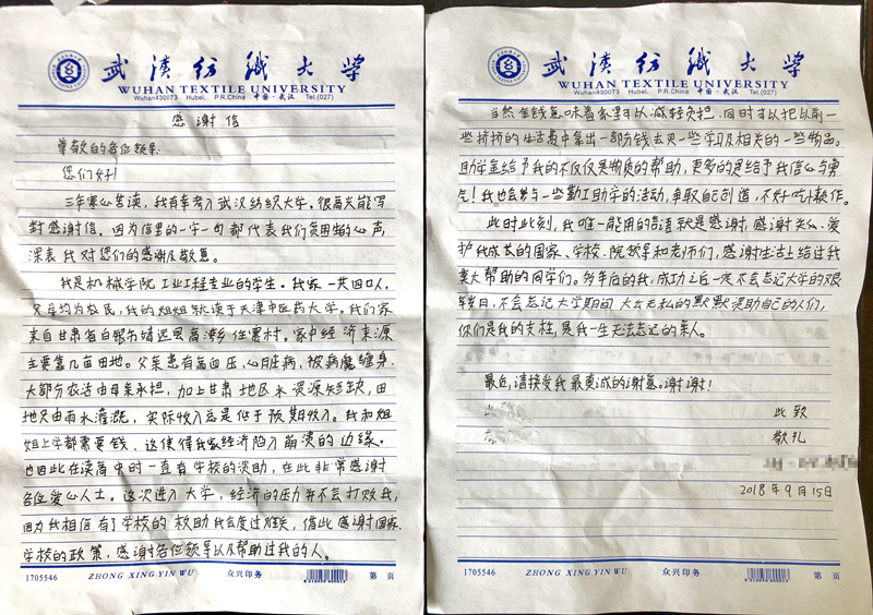 困难新生到校后,学院专门安排绿色通道帮助他们优先办理入学手续,扫清同学们的忧虑,让他们感受到纺大大家庭的温暖。学院领导还深入宿舍,亲切看望和慰问贫困学生,缓解经济窘迫带给他们的无形压力,把党的关怀送到他们身边。对于这些,永利集团18级贫困同学们非常感激,纷纷写来感谢信,表示将好好珍惜这来之不易的学习机会,以自己最大的努力争取优异成绩,来回报党和社会对自己的关怀!