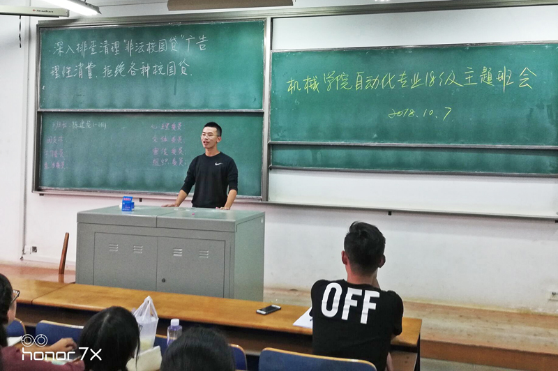 在机械类11801班的班会上,担任班主任的院党委刘韦副书记教育大家理性消费,量入为出,大额消费务必事先征得家长同意。