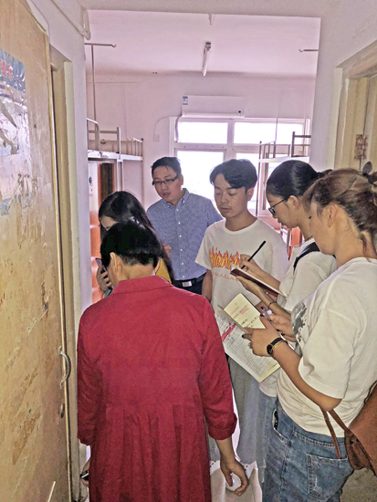在4A、4B和3B学生宿舍,刘书记在走访了高年级学生宿舍后,与18级新生辅导员一道,在学校宿管工作人员的配合下,分头带领18级新生副班主任,仔细查看了宿舍设施,对宿舍门锁、电气、上下水管、龙头、空调、门窗等各处细节进行了细致的查看。对于检查过程中发现仍存在的极个别问题,刘书记指导辅导员和同学们认真做了记录,稍后汇总向宿管和维修部门反馈。