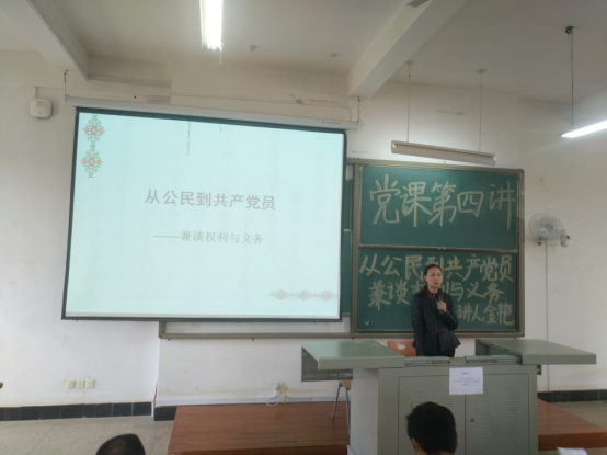 金教授首先简单分析了“公民”与“党员”的区别,告诫大家作为公民要遵纪守法,身为党员更要以身作则。随后金教授详细介绍了党员义务和权利,她指出,党员的义务和权利是相互联系,相互依存的;她强调,党员义务是党章对党员行为的一种规范,我们要履行好党员的职责,并且不断提高自身的思想觉悟、服务意识和责任意识。报告最后,金教授还提到了“青春力量 感动纺大”的评选活动,鼓励大家积极向优秀榜样靠拢。