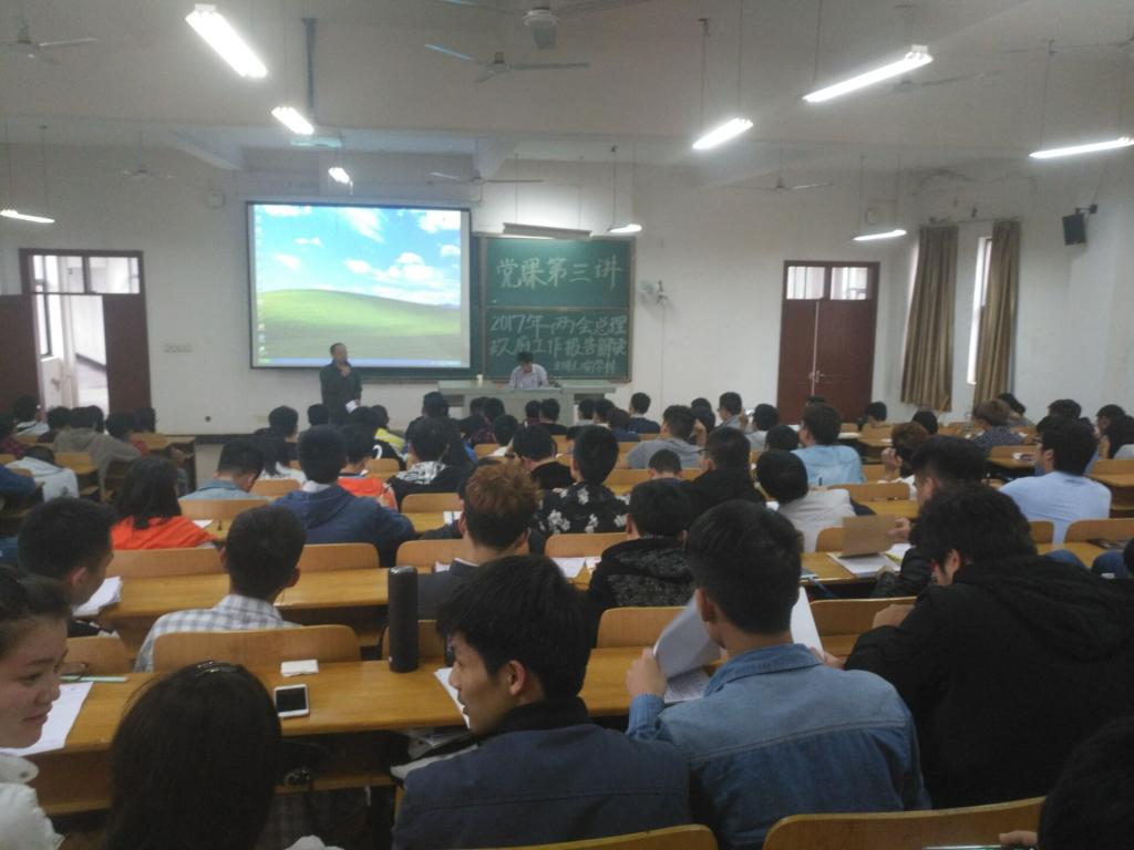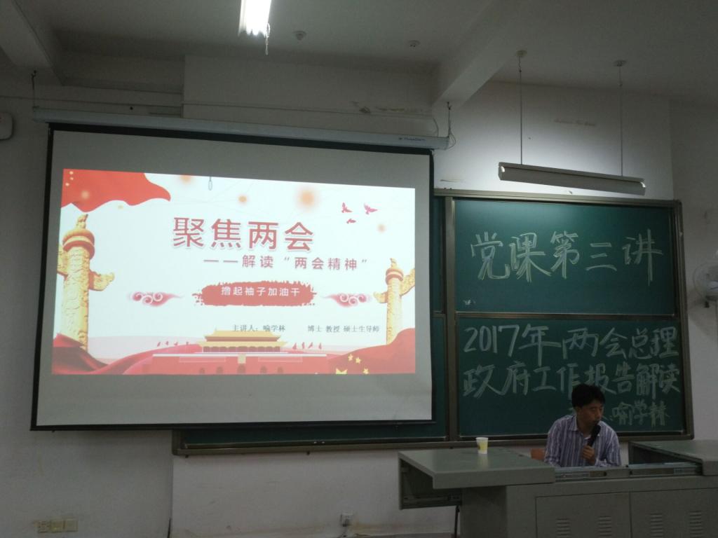 为深入学习贯彻全国两会精神,4月20日,永利集团于阳光校区08D-T201开展了第七十五期党课第三讲,由马克思主义学院副院长喻学林教授为永利集团近200名入党积极分子带来了题为《2017两会总理政府工作报告解读》的报告。