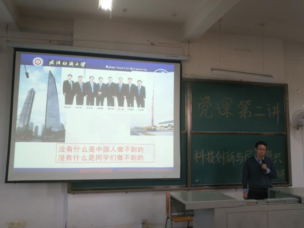 梅教授从“党员大学生的使命和责任”、“树立科学的三观”和“做创新的有用之才”三个方面来阐述。介绍了中国近几年来在经济、军事、教育等方面发生的翻天覆地的变化,从第一次工业革命,一直到现在所提出的"工业4.0"、"中国制造2025",梅教授高度肯定了科技创新的重要性,并呼吁众多学子要坚定不移的坚持"科学发展观"。他还将中国政治制度与西方政治制度相对比,深刻解析了“科技创新与民族复兴”,同时还勉励我们要拥有四个自信:道路自信、理论自信、制度自信、文化自信。“没有什么是中国人做不到的,没有什么是同学们做不到的”梅教授自豪地说。