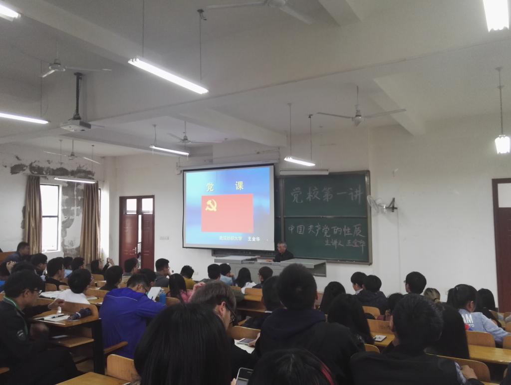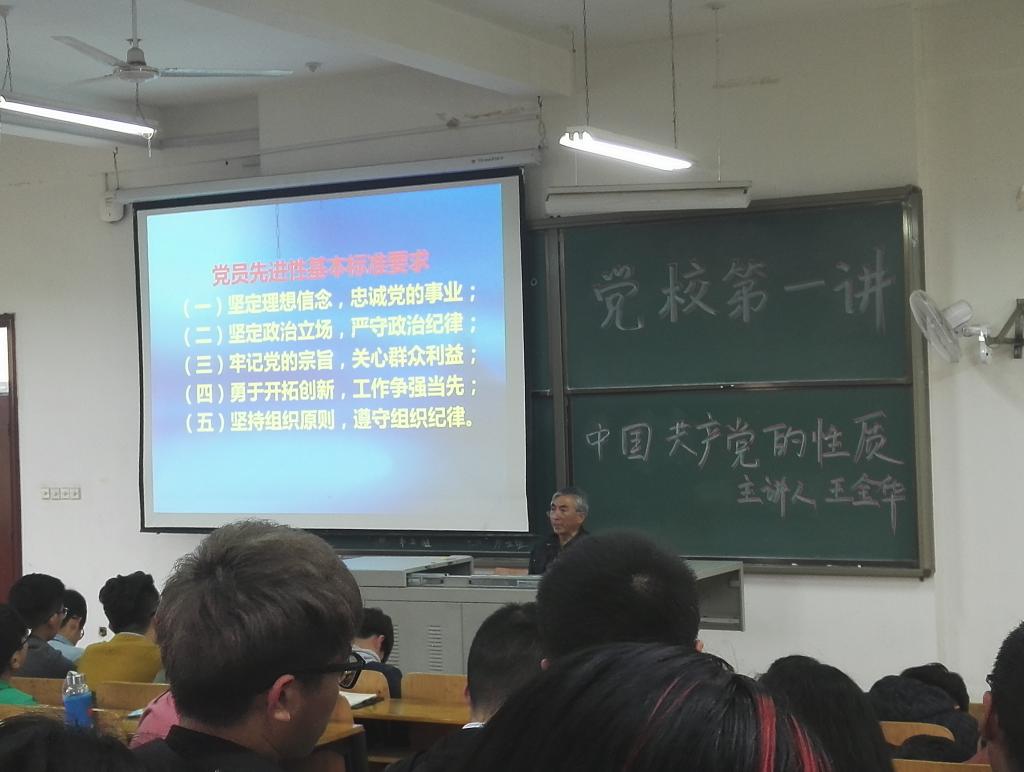 开学典礼结束后,由王金华教授讲授第一节党课《中国共产党的性质》,王金华教授从共产主义同盟的成立到1921党的成立,从十月革命到中国梦,向党校学员们讲述了国际共产主义运动波澜壮阔的历史,同时详细讲解了中国共产党的成长,还用我们身边活生生的例子诠释什么是共产党员,特别是用高杰校友的事例展现了当代大学生党员的党性,引起在场全体学员热烈的掌声,