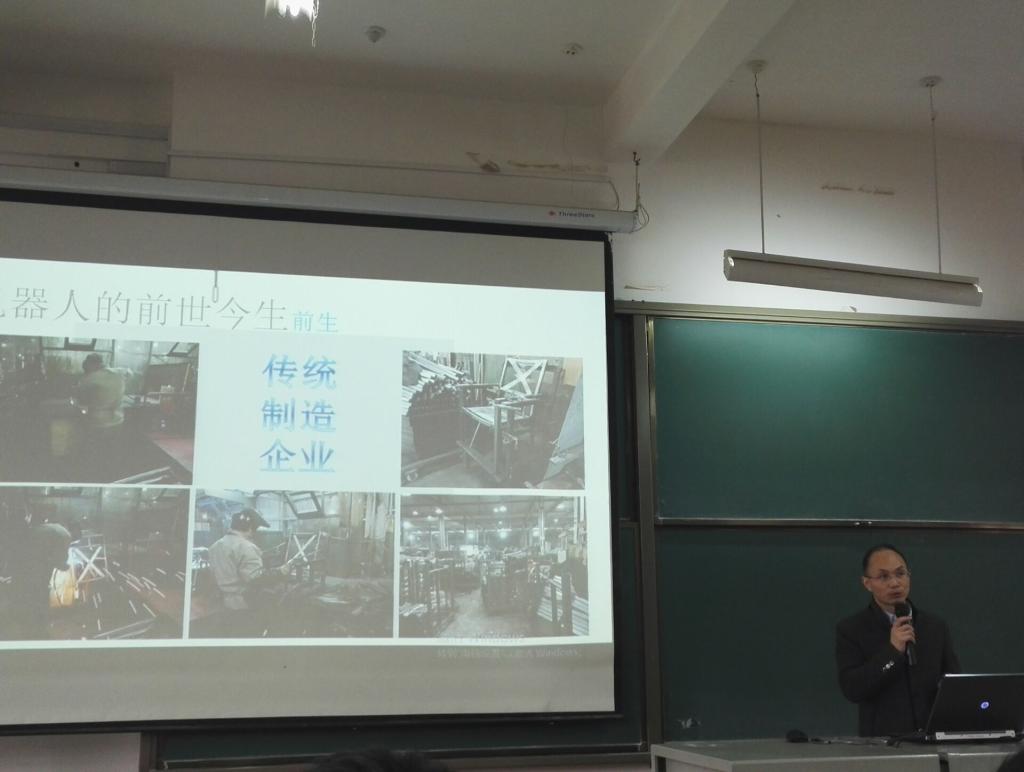 杨先生认为传统机械行业在科技日新月异的社会中应寻找出路,并针对近年不断兴起的智能制造、机器人应用等热点问题,以PPT、图片、视频等形式进行了生动讲解,其中影片《摩登时代》,以幽默的口吻来讲述传统机械行业劳动强度大,加工人员多,批量加工质量不稳定,精度不高等不足之处。报告会分为四个部分:机器人的前世今生、机器人热门应用、智能制造新趋势、智造时代的工匠精神,分别从机器人的基础知识、企业应用、未来发展等方面,为师生提供了一次全面的机器人知识课。