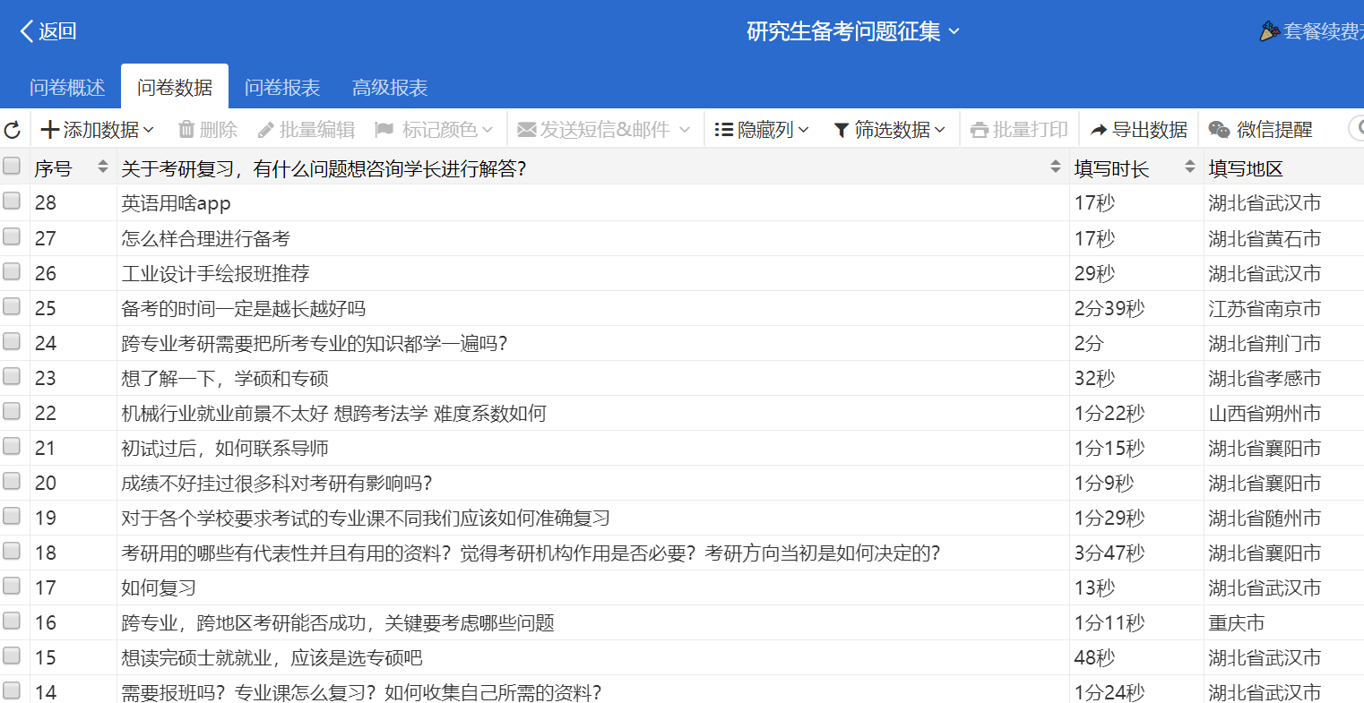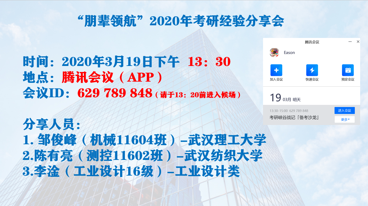 在分享交流环节,三名学长依次向同学们做了分享与交流。报考武汉理工大学的机械11604班邹俊峰同学向大家分享了他确定考研目标院校的经历,以及如何在备考阶段做好时间规划、总结学习方法,提高学习效率。同时,也向学弟学妹强调:只有保持一个良好的心态,坚持不懈、心无旁骛,才能最终成功上岸。报考我院研究生的测控11602班陈有亮同学向大家详细介绍了学院各专业情况、研究生就业前景、2020年研究生招考报考情况等信息。并提醒大家备考要不怕吃苦,多学多练、多总结,只有持之以恒才能取得理想的成绩。最后,工业设计11601班李淦同学向大家介绍了刷题经验、分享了英语单词记忆法,政治知识点联想记忆法等独特的学习方法,并建议该专业的学生在本科阶段应尽早开始画图练习,坚持多动笔,这样才能在专业考试中确保正常发挥。在互动答疑环节,借助在线问卷平台,邹俊峰等三名同学针对大家普遍关注的问题进行了详细解答。