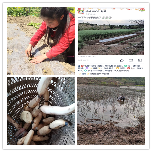 不负春光保春耕,挥洒汗水最美丽。在疫情防控的关键时期和春耕生产重要时节,机械学子积极响应号召,在一线劳动、为一线服务,就地支援春耕生产,将青春汗水挥洒在家乡大地,以接地气的方式为农村发展贡献青春力量。下塘挖藕、修整菜地,2019级学生刘毅笑称自己已是“田园小农夫”;“趁疫情在家的这段时间,再次和家人一起劳作,感觉很亲切。”2018级同学党少俊如是说。