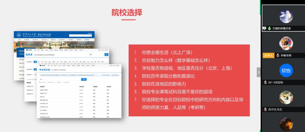 为了更好指导本科生的考研工作,帮助大家圆梦考研梦。4月22日,永利集团邀请了2015级机械优秀考研学子方圆(华南理工大学)、王海(东华大学)、闵雅(武汉理工大学)等三位同学,在腾讯会议平台向2017级同学做考研经验分享。