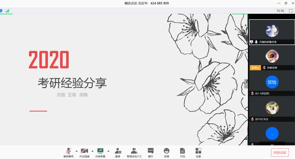 会上,三位考研成功的学长学姐分享了他们的考研经验和心路历程。从心态调整,时间安排,注意事项等方面,细致耐心地与到场同学进行交流。方圆学姐结合自己研究生入学以来的学习体会,告诉大家一定要首先明确自己为什么要考研,不能抱着试一试的心态,只有毫不动摇的坚定考研决心,才能在这场持久战中坚持到最后;王海学长向大家分享了自己在备考过程中复习数学的一些经验和教训,希望同学们能够尽快找到适合自己的学习方法;闵雅学姐向大家回顾了自己大学四年学习英语的一些体会,并交流了实用的单词记忆法、分享了一些高效的学习软件。同学们一边听讲一边积极的在线上与学长学姐进行互动交流,现场气氛热烈。