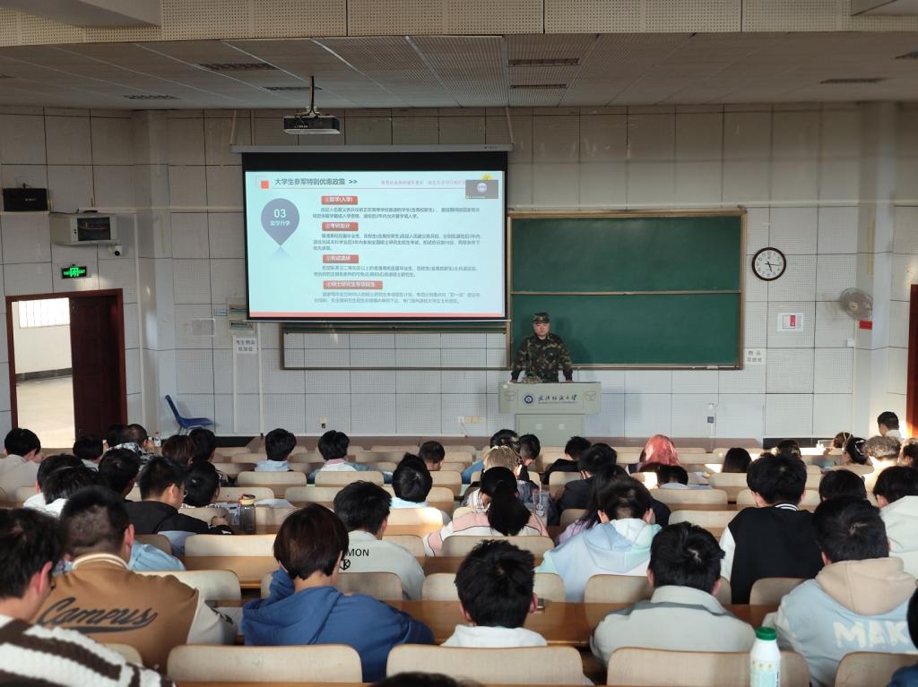 为活跃气氛,宣讲会设置了军事常识有奖竞猜环节,考查大家对中国人民解放军武器装备和军事历史的了解和认识,同学们纷纷积极参加互动,并获得了精美的定制纪念品。而后,方林老师以“投身火热军营,创造精彩人生”为题,从征兵流程、经济补助、政策优待、个人职业发展等多方面对大学生士兵参军入伍进行了详细解读。同时,通过往届参军入伍学长考取军校继续深造、通过士兵计划成功读研以及入伍期间参加各项军事行动等事例让大家感受到参军入伍、报效祖国与当代大学生的紧密联系。