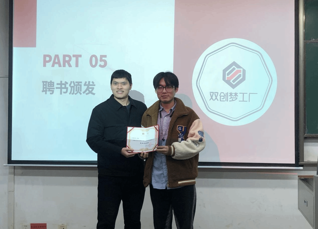 2024年永利集团双创梦工厂迎来第一位创新创业朋辈导师。大会第5项,辅导员徐智航为闫育杰学长颁发聘书。