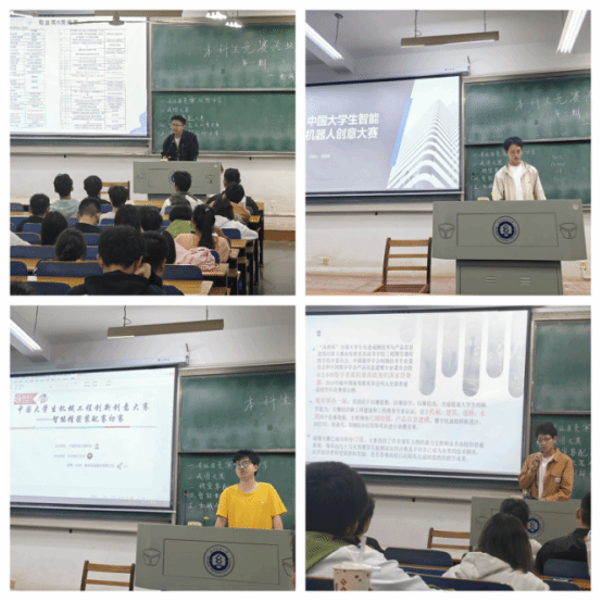 首先,由张厚强讲述了竞赛的分类,分享了专业比赛经验;接着赵实权同学结合自身经历从什么是成图大赛、大赛的类型、参赛前准备等方面对成图大赛进行全面介绍;随后,聂骏杰,张庆乐详细讲解了精密装配大赛、智能机器人创意大赛的竞赛项目、作品要求、评分标准等内容;然后,陈永康向同学们讲述了机械创新设计大赛的背景和目标,并分享了相关专业知识和实践经验;最后,五位学长与在场同学进行了互动答疑,现场气氛活跃,同学们收获颇丰。