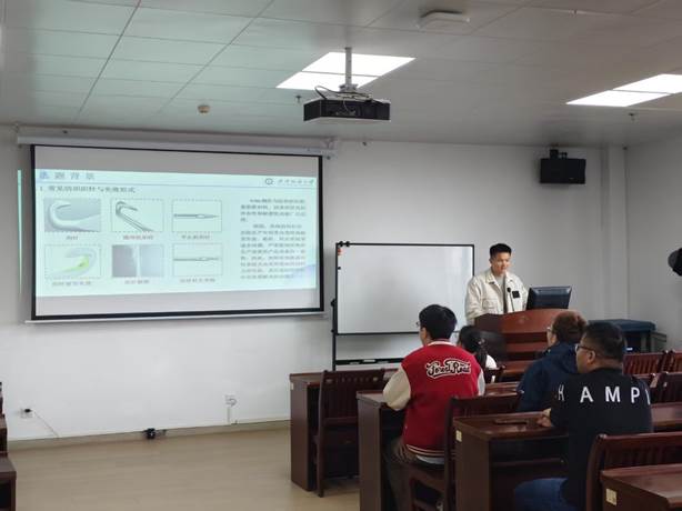 吴舒杨分享了“喷气织机柔性纬纱多尺度本构模型及其力学性能研究”,这位同学的课题“喷气织机柔性纬纱多尺度本构模型及其力学性能研究”涉及到纺织工程领域中的一个重要方面,即如何通过建立和分析柔性纬纱(即横向穿过织物的纱线)在喷气织机上的行为模型来改进织物的质量与生产效率。通过实验和数值模拟相结合的方法,研究纬纱在拉伸、弯曲、扭转等不同加载条件下的力学性能。特别关注的是纬纱在喷气织机上受到的动态载荷影响。通过对柔性纬纱多尺度本构模型的研究,可以实现更高的织造精度和更好的产品性能,从而满足市场对高质量织物日益增长的需求。
