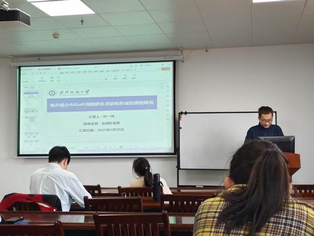 叶一鸿同学分享了“高AI组分AIGaN薄膜掺杂点缺陷形成机理的研究”,AlGaN是一种重要的III族氮化物半导体材料,因其具备宽禁带、高击穿电场和良好的热稳定性等特性,在紫外光电器件(如UV LED和激光器)、功率电子器件以及高温电子器件等领域具有广泛的应用前景。随着Al组分的增加,AlGaN能够覆盖从可见光到深紫外波段的发光需求,但同时也会面临更多的技术挑战,比如更高的位错密度和更难控制的掺杂效率。因此,研究高Al组分下AIGaN薄膜的掺杂点缺陷形成机理对于提升材料质量和器件性能至关重要。其探讨不同掺杂剂(如硅Si用于n型掺杂,镁Mg用于p型掺杂)在高Al组分AIGaN中的应用效果及其对点缺陷形成的影响。这项研究不仅深化了我们对AlGaN这类重要半导体材料的认识,也为相关应用领域提供了重要的技术支持,有助于解决实际工程中遇到的问题,推动科技进步。
