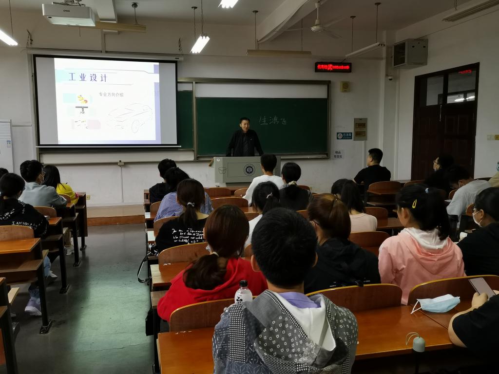 生鸿飞老师在03-112教室为工业设计专业同学介绍了专业的概念、课程体系、以及该专业的文化历史和背景,同时引用生活实物讲解了专业知识的运用过程,并就大家关心的就业前景与大家做了热烈的互动。