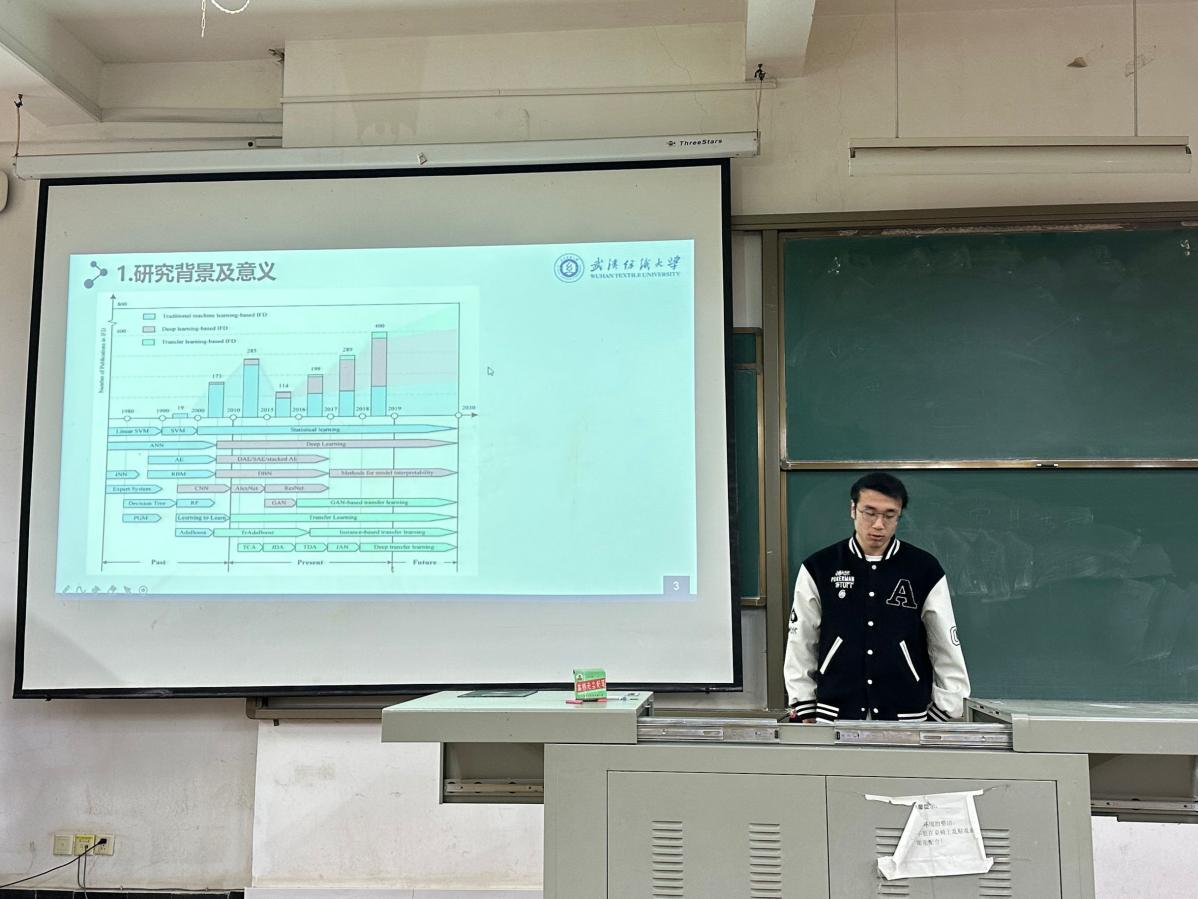 韩忠泽同学的分享主题是“基于深度学习的滚动轴承故障诊断与预测研究”。沈忱老师对韩忠泽同学的分享给出了建议:一是确认项目所提供的结果是初始结果还是处理后的结果?二是针对PPT深度学习汇报模块需进一步深入。