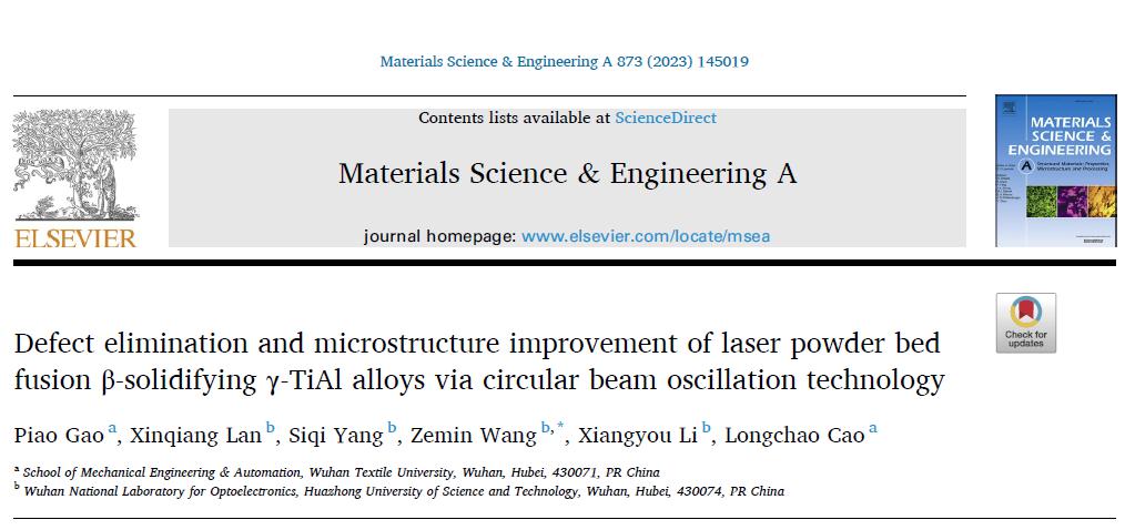 近日,yl6809永利集团曹龙超课题组青年教师高飘博士在激光增材制造钛铝合金工艺与机理方面取得了重要的研究进展。相关成果以“Defect elimination and microstructure improvement of laser powder bed fusion β-solidifying γ-TiAl alloys via circular beam oscillation technology”为题发表在材料科学领域中科院一区Top期刊《Materials Science & Engineering A》(ISSN:0921-5093)上。该论文的第一单位为yl6809永利官网集团,第一作者为高飘博士。